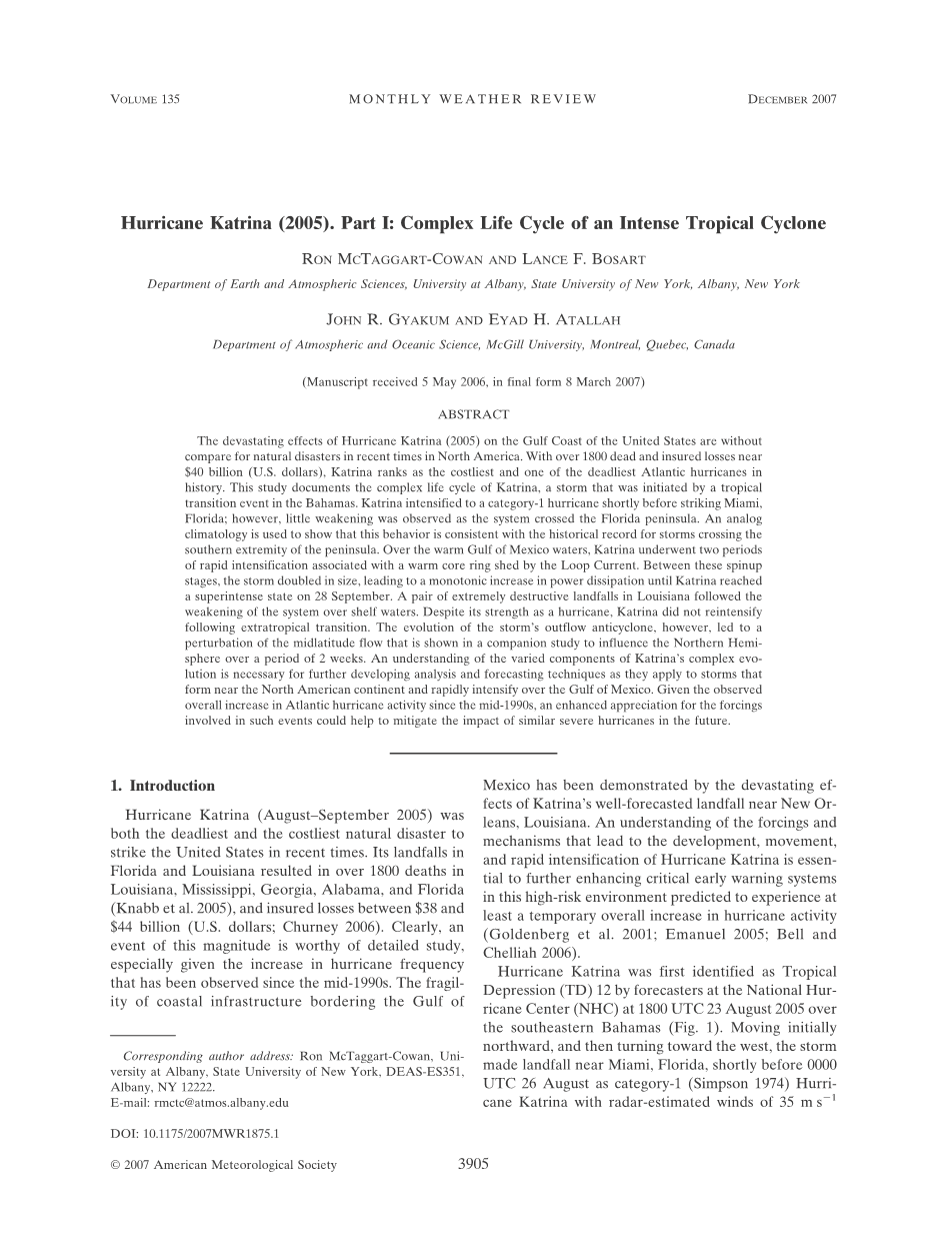 本研究的重点是记录复杂生命周期的飓风卡特丽娜,和重点解释风暴的演变过程中的动力和热力结构的特征和作用。其中包括初始旋涡的发展和后续热带过渡 (TT; Davis and Bosart 2004),穿越佛罗里达半岛的风暴,集中到墨西哥湾之后着陆。因此作为一个此研究的介绍人员 [McTaggart-Cowan et al. (2007)hereafter referred to as Part II]调查这种强烈的热带气旋的半球影响,后者将强调衰减系统在中纬度中的影响。