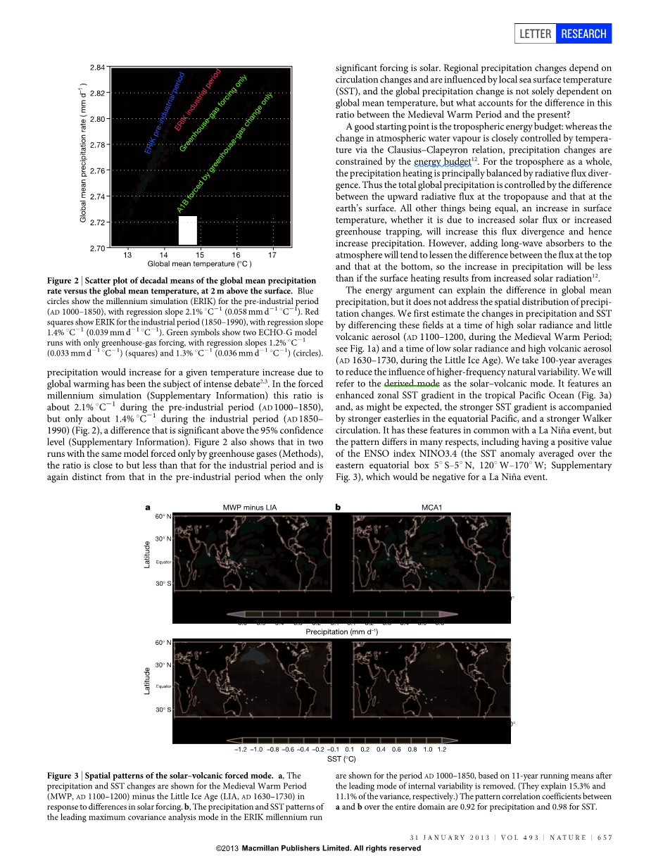 令人瞩目的是,虽然二十世纪晚期比中世纪温暖时代温和,但降雨量较少(图1)。由于全球变暖,给定的上升温度将导致全球降水量增加多少是激烈辩论的主题。在千年强迫模拟(补充资料)中,这一比例在工业前期(AD1000-1850)期间约为2.1% °C-1,但在工业时期(AD1850- 1990年)仅为约1.4% °C-1(图2),差异在于高于95%置信水平(补充资料)。图2还显示,在同一模型的两个场中,仅在温室气体强迫下(方法),该比例接近但小于工业化时期,再次与唯一有意义的强迫是太阳能的工业前期相比有显着差异。区域降水变化取决于循环变化,受当地海面温度(SST)的影响,全球降水变化不仅仅取决于全球平均气温,但是怎么解释该比例在中世纪暖期与目前的差异?