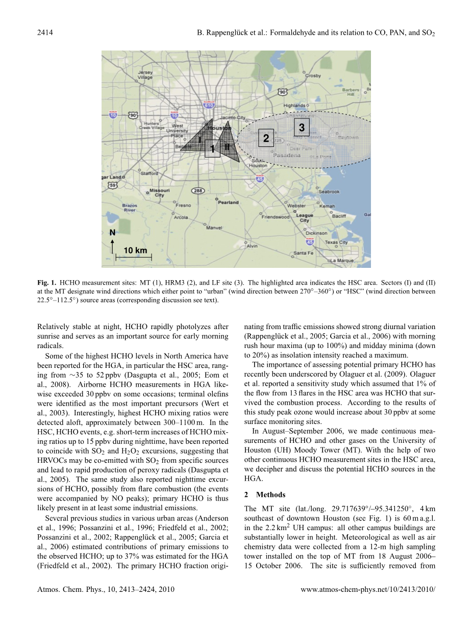 HGA因为是北美HCHO水平最高的地区而受到关注,特别是HSC区域,范围在35-52ppbv之间(Dasgupta et al.,2005; Eom et al.,2008),在某些情况下,HGA大气中的HCHO观测值显著超过30ppbv;末端烯烃被确认为是HCHO最重要的前体物(Wert et al.,2003)。有趣的是,最高HCHO混合比率出现在高度大约在300-1100米之间。据研究在HSC地区,HCHO事件例如在夜间HCHO混合比短时间增加至高达15ppbv,其与SO2和H2O2的偏移一致,这表明HRVOC与有特定来源的SO2有共同的排放源,并导致快速生成过氧自由基(Dasgupta et al.,2005)。也有同样的研究通过HCHO的夜间观测,提出HCHO可能来自燃烧过程(事件伴随着NO峰)。因此 HCHO的主要来源可能是一些工业排放物。