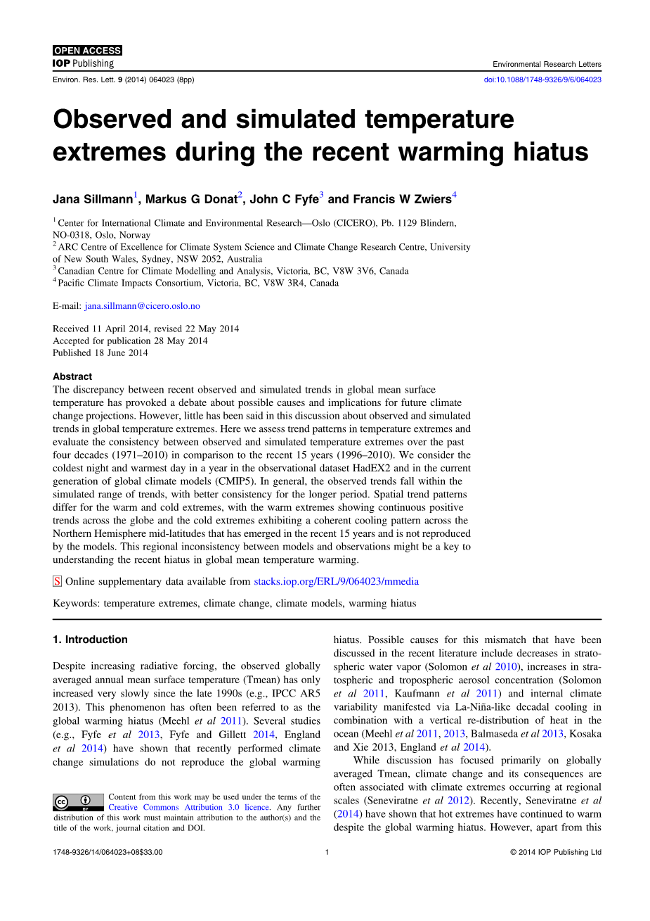 Jana Sillmann1, Markus G Donat2, John C Fyfe3 and Francis W Zwiers4