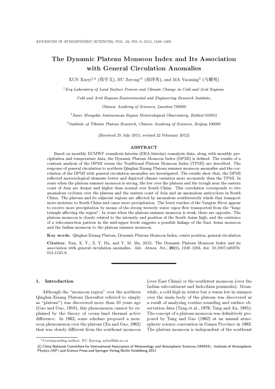 引用:Xun, X. Y., Z. Y. Hu, and Y. M. Ma, 2012: The Dynamic Plateau Monsoon Index and its association with general circulation anomalies. Adv. Atmos. Sci., 29(6), 1249–1263, doi: 10.1007/s00376-012-1125-9.