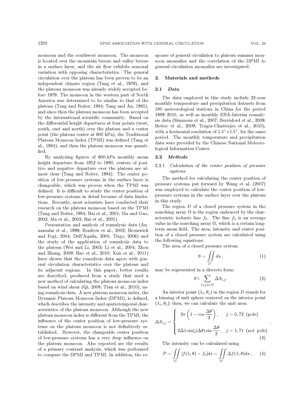 虽然暖低压和风场会聚的中心重合,但高原季风的中心位置是可变的。尽管最近使用风切变,但未考虑新高原季风指数(Qi,2008;Tian等,2010)和TPMI的低压系统在高原上的表层中心位置的影响。低压系统的中心位置变化,对高原季风有很大的影响(汤懋苍等,1984)。 因此,一个合理的想法是,高原季风的变化可以使用TPMI和引入低压系统的中心位置来测量。这种用于高原季风指数,DPMI,TPMI的修正的新计算方法由下式给出