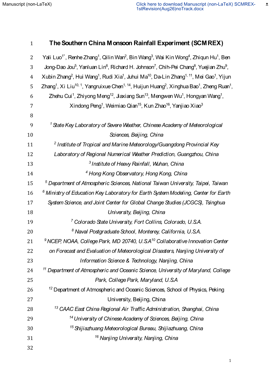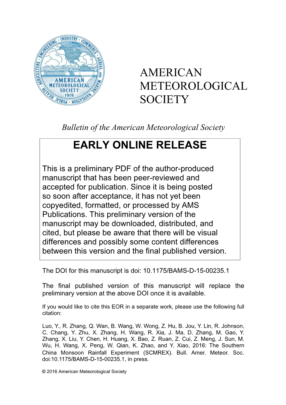 Luo, Y., R. Zhang, Q. Wan, B. Wang, W. Wong, Z. Hu, B. Jou, Y. Lin, R. Johnson, C. Chang, Y. Zhu, X. Zhang, H. Wang, R. Xia, J. Ma, D. Zhang, M. Gao, Y. Zhang, X. Liu, Y. Chen, H. Huang, X. Bao, Z. Ruan, Z. Cui, Z. Meng, J. Sun, M. Wu, H. Wang, X. Peng, W. Qian, K. Zhao, and Y. Xiao中国气象科学研究院灾害天气国家重点实验室,北京,中国