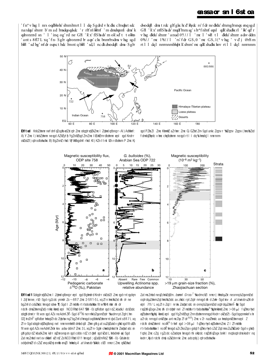 8百万年前中国风积物的开端导致了在赵家村和八家嘴 (35°53'N,107°27'E),即在黄土高原最广阔的平坦地区有长久持续陆栖生物记录(图1),也导致了一个区域在东亚夏、冬季风时期对高原隆起变化非常敏感15。这些结论(图4)包含两个部分:上层与著名的罗春时序小于等于2.6百万的黄土高原古土壤资料(ref.16)有关系,而古土壤序列资料一直与深海沉积物相关;下层的红色黏土序列资料包含夹层的淡红色依粉黄土和淡红色棕红色古土壤过渡,土壤层上准常规的晶粒度分布,40%-60%的淤泥部分,其他的化学物理特性,表明沉积物风积开始6,7,17。所有在黄土高原东北的淤泥调查研究与西北部冬季风一致。由它们的颜色,纹理,钙质的小节点反映出来的古土壤成壤作用的深度,使得东南向增加夏季季风时期降水区域转变。