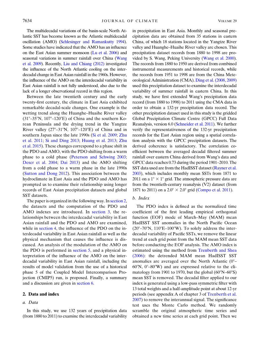 东亚降水的年代际变化不同于厄尔尼诺和南方涛动(即ENSO)有关的赤道中东太平洋年际间变化。低频变化在北太平洋温带地区更加重要,这些变化被称之为太平洋年代际振荡(PDO)(Zhanget al. 1997; Mantua et al. 1997)。有些研究已经证明了东亚降水年代际变化与PDO的关系。有人已经发现PDO的暖位相与中国东部降水量距平呈较好的正相关(Zhuand Yang 2003; Lau et al. 2004; Zhu et al. 2015)并且1960s–2010s时期PDO冷位相与中国东部降水量距平呈负相关。但是,由于观测资料的缺少,六十年代之前东亚夏季降水年代际变化和PDO的关系仍然不是很清楚。