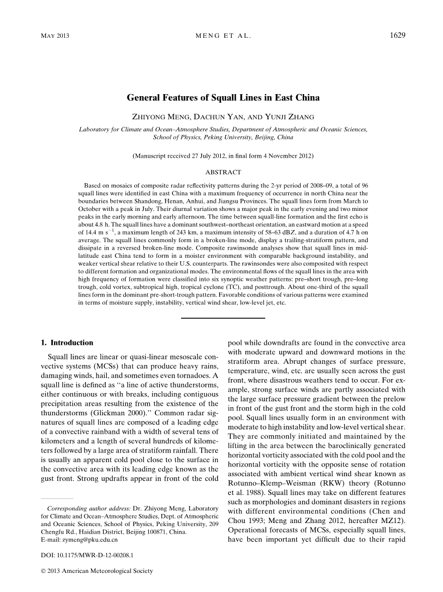 在美国飑线经常造成灾害性天气的发生,这些灾害性天气的形势和灾情被完整的记录(例如,Bluestein and Jain 1985; Wyss and Emanuel 1988; Houzeetal 1990;Geerts 1998;Parker and Johnson 2000;Jirak 2003等)。 飑线也常常造成中国的灾害性天气。例如,2009年6月,河南省的一条飑线(图1中约34°N,114°E的位置),造成了29.1 m s-1的强风,导致27人死亡(张 等2012)。以前还有台湾海峡亚热带飑线的研究(陈和周,1993)和热带气旋(TCs)在中国登陆前期的特征(MZ12)。这些研究表明,中国的亚热带和热带气旋前飑线趋向于具有较短的最大长度,相近的运动速度,相对亚热带飑线(台前飑线)的更长(更短)的寿命,但具有相似的地层环境不稳定,较低的垂直风切变,并且相对于美国而言更为潮湿。然而,中国大部分地区的飑线的一般特征,以及它们的气候特征和与其他地区如美国的飑线之间的区别是未知的。