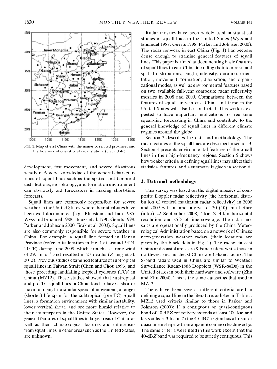 在美国,雷达组合回波已经广泛应用于飑线的统计研究(Wyss和Emanuel 1988;Geerts 1998;Parker和Johnson 2000)。华东地区的雷达网络(图1)已经足够密集以研究飑线的一般特征。本文旨在记录华东飑线的基本特征,包括其时空分布、广度、强度、持续时间、方向、移动、形成、耗散和发展模式,以及基于2008年和2009年的全年复合雷达反射率组合回波得出的环境特征。同时将进行华东与美国之间的飑线特征的比较。这项工作对中国实时飑线预测具有重要意义,有助于在全球不同气候条件下总结出共同的特征。