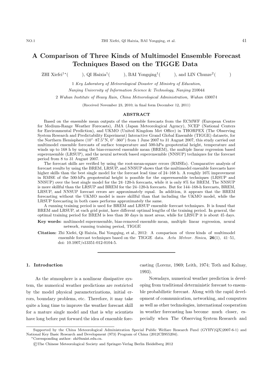 关键词:多模式超级集合,消除偏差集合平均,多元线性回归,神经网络,滑动训练期,TIGGE