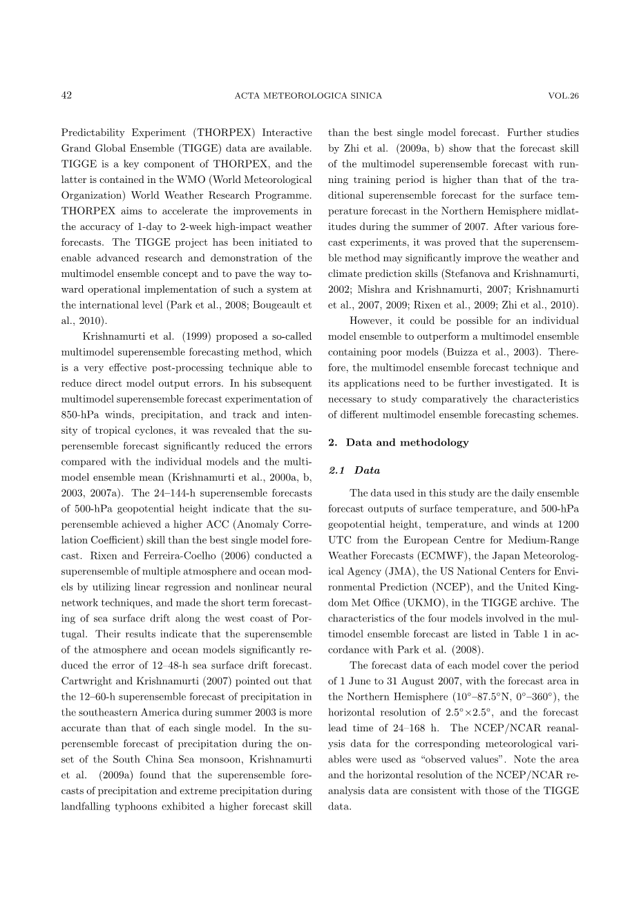 Krishnamurti等人(1999)提出了一个所谓的多模式超级集合预报方法,这是一种非常有效的后处理技术能够直接降低模型的输出误差。他在随后的有关850 hPa风、降水、热带气旋的路径和强度的多模式超级集合预报试验,揭示了超级集合预报相对于单一模式和多模式集合平均显著降低误差(Krishnamurti et al., 2000a, b, 2003, 2007a)。24–144 h 500 hPa位势高度超级集合预报表明超级集合与最好的单一预测模型相比取得更高的ACC(异常相关系数)的技术。Rixen 和 Ferreira-Coelho(2006)利用线性回归和非线性神经网络技术对多个大气和海洋模型进行了超级集合,并对沿葡萄牙西海岸的海面漂流做出短期预测。他们的研究结果表明,大气和海洋模式的超级集合使12–48 h海面漂移预测误差明显减少。Cartwright and Krishnamurti (2007)指出,2003年夏季在美国东南部12–60 h降水的超级集合预报比每个单一模型更准确。在南海季风期间对降水的超级集合预报中,Krishnamurti et al. (2009a)发现在台风登陆期间降水和极端降水的超级集合预报表现出比最好的单一模式预报更好的预报能力。智协飞等(2009 a,b)进一步研究表明,在2007年夏季北半球中纬度地面气温预报中滑动训练期超级集合预报技巧明显高于传统的固定训练期超级集合预报技巧。在各种预报的实验中,证明了超级集合方法可以显著提高天气和气候预报技巧(Stefanova and Krishnamurti,