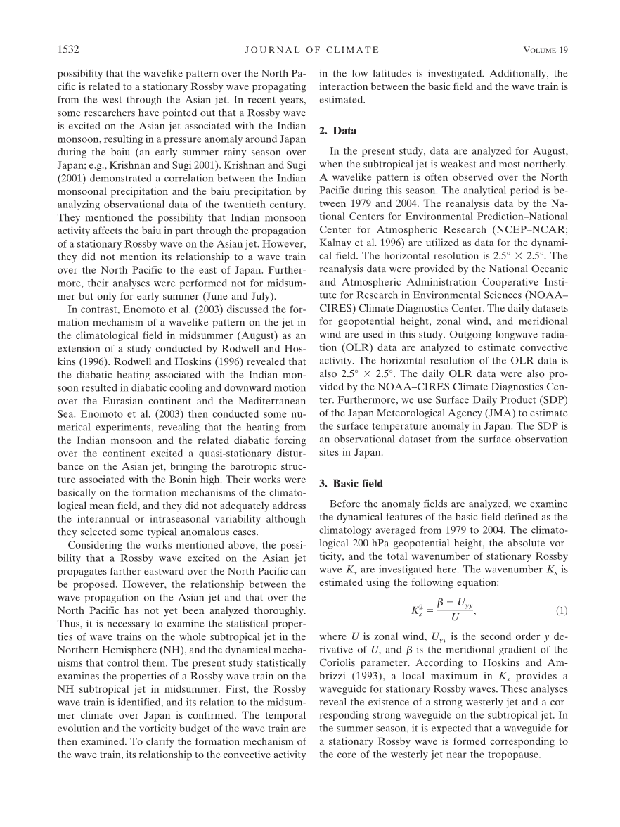 相反,Enomoto 等(2003年)讨论了夏季(8月)气候学领域波列形式的形成机制,作为Rodwell和Hos-kins(1996)进行的一项研究的延伸。罗德威尔和霍斯金斯(Rodwell和Hoskins,1996)揭示,与印度季风相关的非绝热加热导致欧亚大陆和地中海非绝热低压下的向下运动。 Enomoto 等(2003)然后进行了一些数值实验,揭示了印度季风的升温和非洲大陆上相关的非绝热强迫引起了亚洲上空气流的准静止扰动,使与Bonin有关的正压结构升高。他们的研究基本上是关于气候平均场的形成机制,尽管他们选择了一些典型的异常情况,但他们并没有充分地处理年际或季节内变率。考虑到上面提到的研究,可以提出在亚太急流上增强的Rossby波在北太平洋上向东传播的可能性。然而,亚洲上空气流引起的波列传播与北太平洋波浪传播之间的关系尚未完全分析。因此,有必要研究整个北半球副热带急流中波列的特征以及控制它们的动力学机制。本研究统计检验了夏季后期NH副热带急流上Rossby波列的特性。首先,确定了罗斯贝波波列,并证实了它与日本中旬地区气候的关系。然后检验波列的时间演变和涡量变化。阐明波列的形成机理,同时在低纬度地区研究该机理与对流活动的关系。此外,估计基本场和波列之间的相互作用。