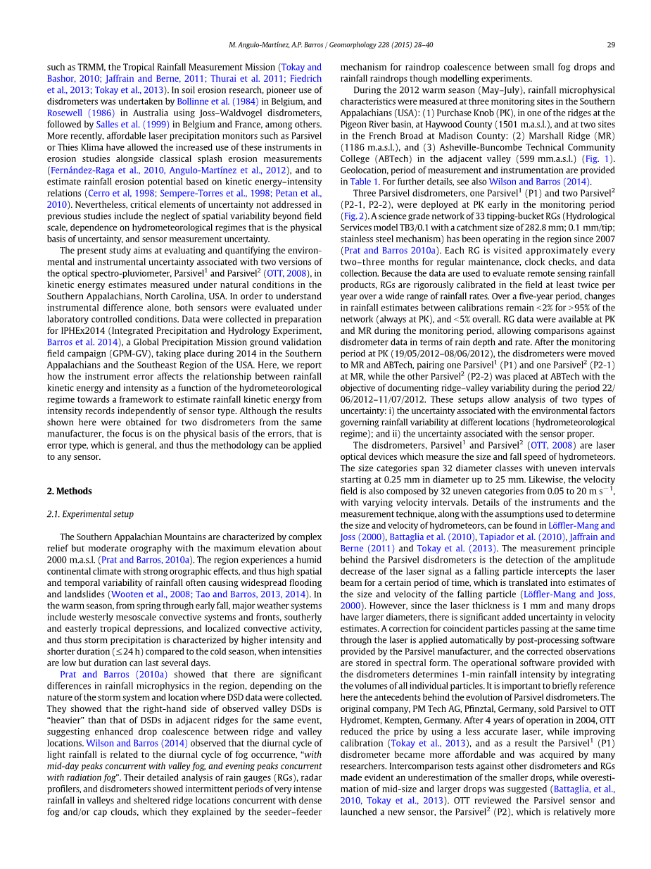在2012年温暖季节(5月至7月)期间,南阿巴拉契亚(美国)的三个监测点测量了降水微物理特征:(1)购买旋钮(PK),位于海伍德县皮鸽河流域的一个山脊 (1501 masl),以及麦迪逊县法国广播中的两个地点:(2)马歇尔岭(MR)(1186 masl)和(3)阿什维尔 - 邦科姆技术社区学院(ABTech) .asl)(图1)。 表1提供了地理定位,测量和仪器使用期限。更多细节,请参阅Wilson和Barros(2014)。