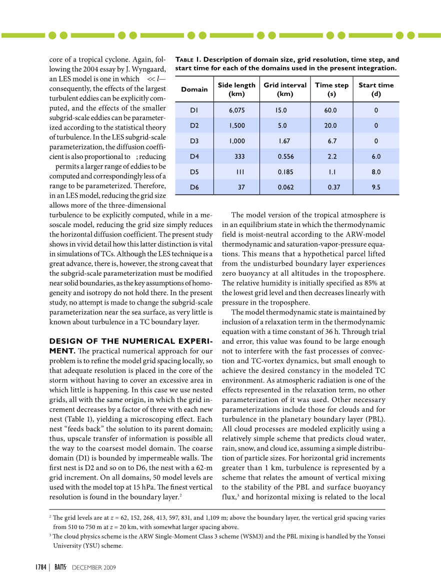 数值试验的设计。我们问题的实际数值方法是在局部优化模式网格间距,所以在风暴的中心设置足够高的分辨率,而不需要覆盖一个几乎没有发生的过度区域。在这种情况下我们利用网格嵌套,它们有着相同的原点,分辨率往里每层减少三倍(表1),产生一种显微镜的效果。每个网格的“反馈”的方案是给它的上一级网格区域;因此,信息向上一级传递可能一直到最粗糙的模式区域。最粗糙的区域(D1)边界条件为固定边界条件。第一层嵌套为D2一直到D6,网格以62-m格点为增量。在所有的嵌套区域内,模式垂直分层为50层,模式层定为15hPa。最好的垂直分辨率在边界层中发现。