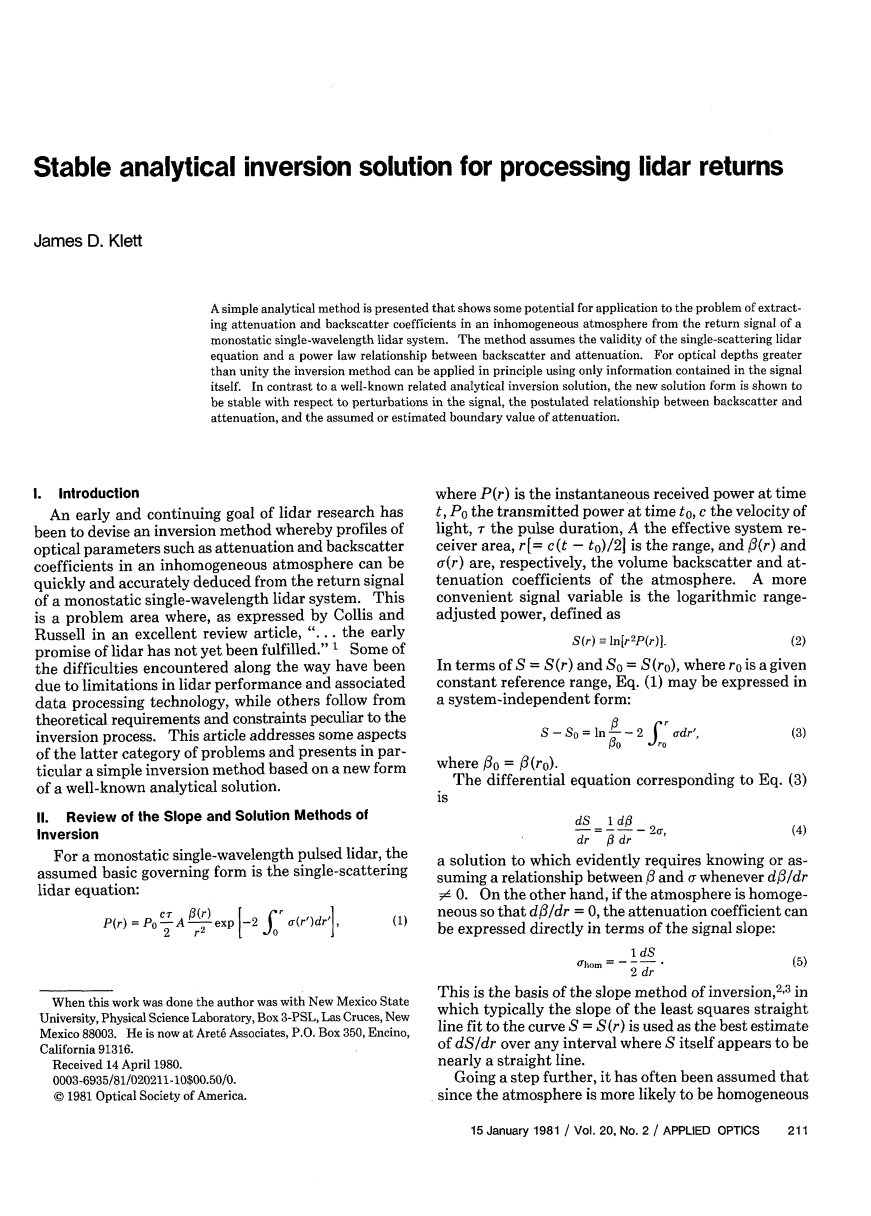 这个的解决方案显然需要知道或假设和sigma;关系,而且要求。另一方面,如果大气是均匀的,,衰减系数可以在信号斜率直接表示为: