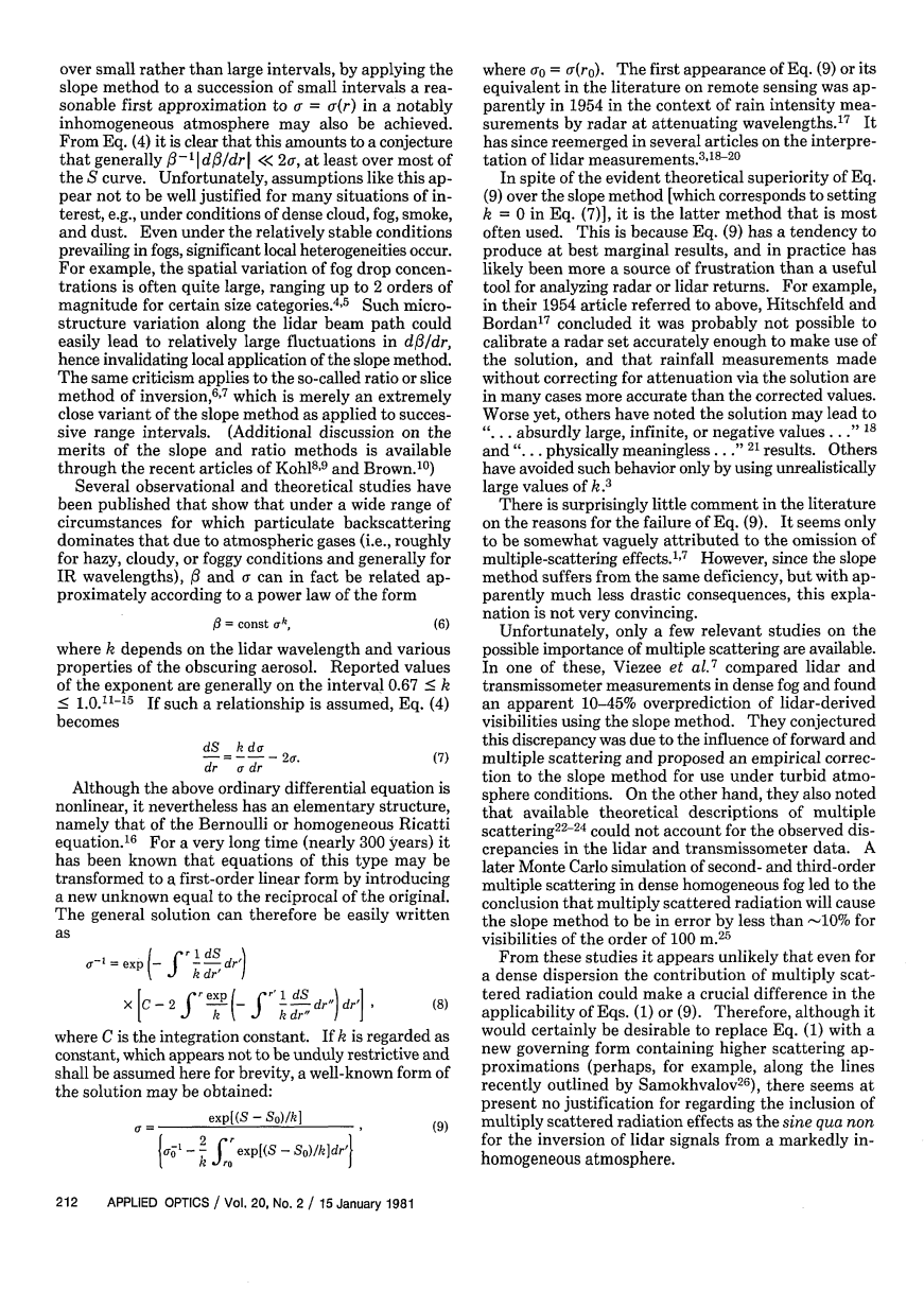 。第一次出现的(9)式或其等效的遥感文献显然是在1954年雨强度测量雷达衰减波长的背景下。它已经出现在了几篇关于激光雷达测量结果的解释。