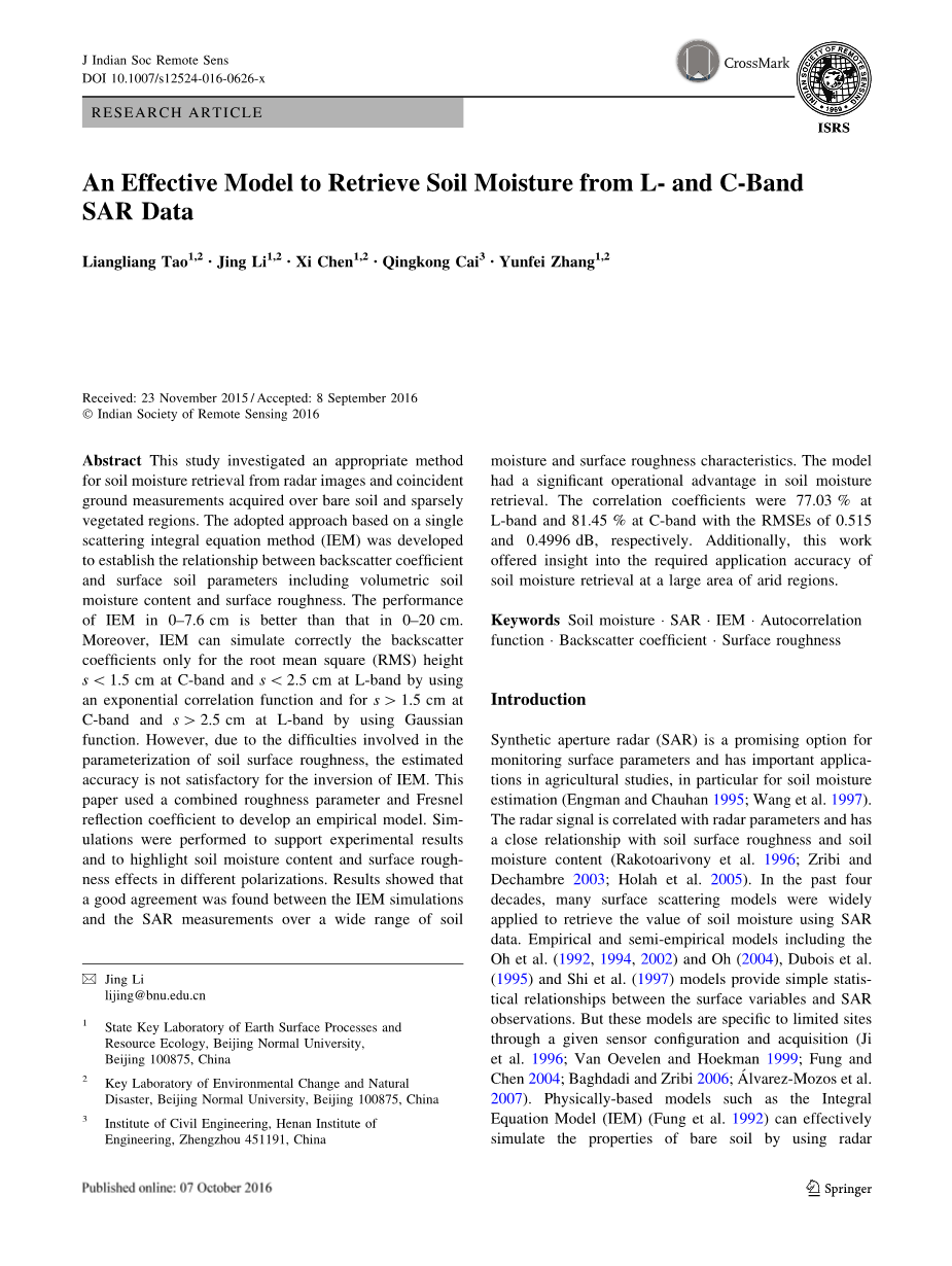 合成孔径雷达(SAR)在监测表面参数方面很有前景,在农业研究中尤其是土壤水分估算具有重要应用(Engman and Chauhan 1995; Wang et al.1997)。雷达信号与雷达参数、土壤表面粗糙度和土壤含水量密切相关(Rakotoarivony et al.1996; Zribi and Dechambre 2003; Holah et al.2005)。在过去的四十年中,许多表面散射模型被广泛应用于通过SAR数据反演土壤的含水量。一些经验和半经验模型,提供了表面变量和SAR观测之间的简单统计关系(Oh et al. (1992, 1994, 2002);Oh 2004, Dubois et al. 1995;Shi et al. 1997)。但是,这些模型只适用于那些拥有固定传感器并能被获取的站点(Ji et al. 1996; Van Oevelen and Hoekman 1999; Fung and Chen 2004; Baghdadi and Zribi 2006;Alvarez-Mozos et al. 2007)。基于物理的模型,如积分方程模型 (IEM) (Fung et al. 1992),我们可以通过雷达频率、入射角、表面粗糙度和介电常数,有效地模拟裸土的性质。 但是,这种方法很复杂,需要庞大的计算量。