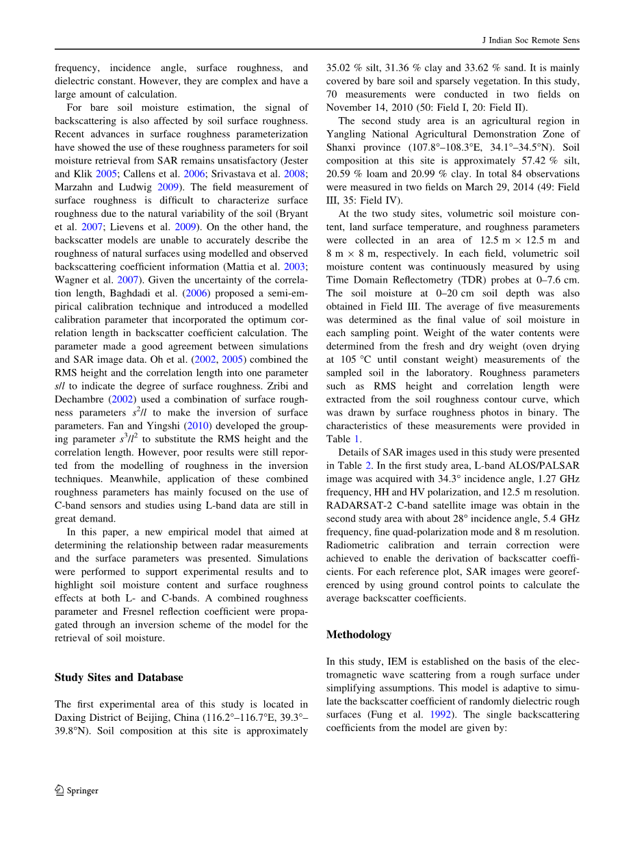 如上所述,IEM可以通过利用适当的土壤中的含水量和具有特定粗糙度参数的自相关函数来有效的再现后向散射系数。但是,估计的精度差,RMSEs为3-4dB,偏差为7dB.有研究报告指出粗糙度参数的测量无法达到良好的准确度(Oh and Kay1998; Verhoest et al. 2008)。在本研究中,建立了一个有效的模型,通过引入组合粗糙度参数和菲涅尔反射系数来提高IEM的性能。