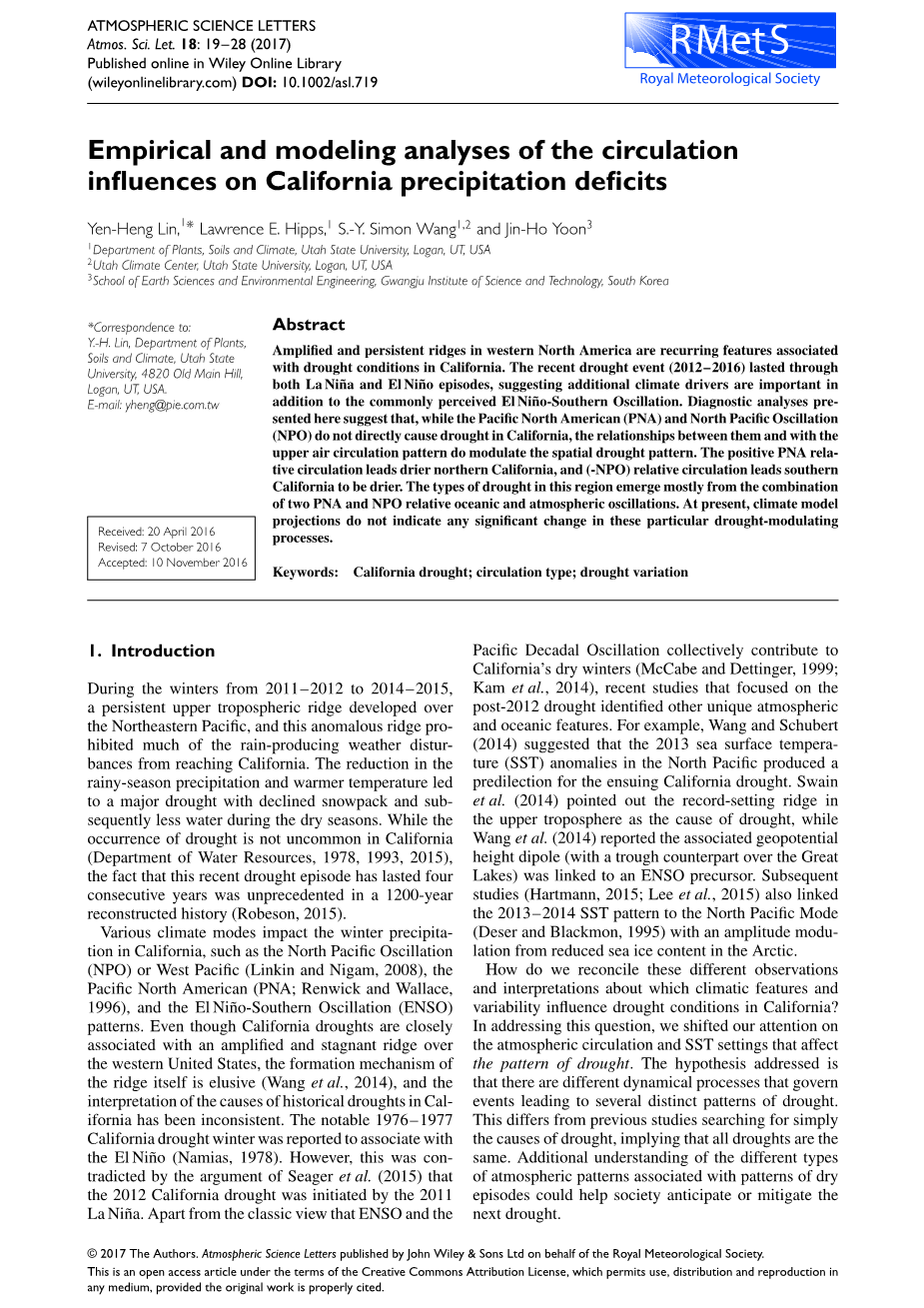 我们如何调和这些不同的观察和解释,哪些气候特征和变异性影响加州的干旱条件,在出路这个问题时,我们把注意力转向了影响干旱模式的大气环流和SST环境。解决的假设是有不同的动力过程管理导致几种不同的干旱模式的事件。这与以前的研究只是简单的寻找干旱的原因不同,这意味着所有的干旱都是一样的。另外了解与干旱发生模式相关的不同类型的大气模式可以帮助社会预测或减缓下一次干旱。
