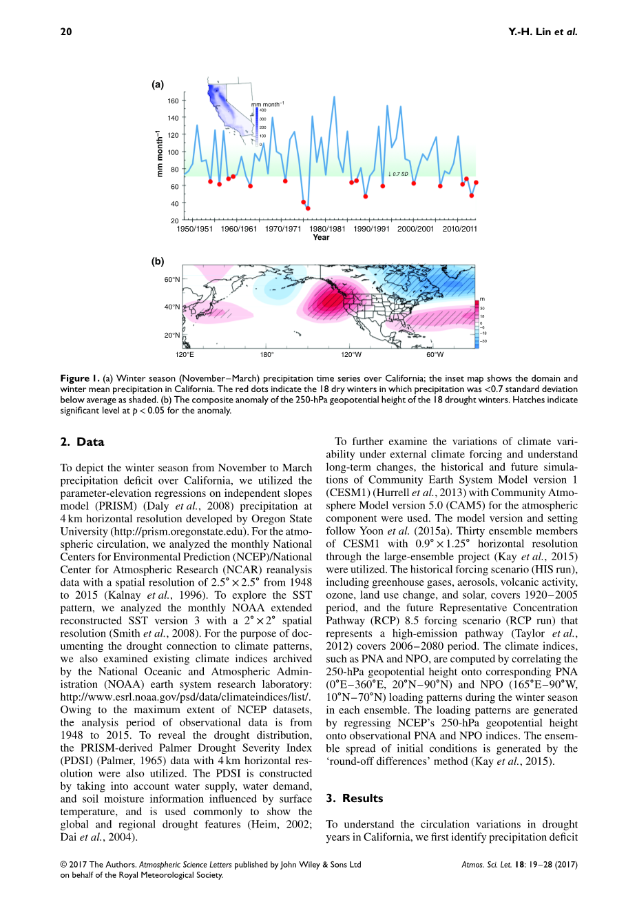 为了描述11月到3月冬季加州降水量减少的冬季,我们利用俄勒冈州立大学开发的水平分辨率为4km的独立斜坡模型降水参数海拔回归。对于大气环流,我们分析了国家环境预测中心,国家大气研究中心的再分析资料,空间分辨率从1948年的2.5✖️2.5到2015年。为了探索SST模式,我们分析了每月的NOAA扩展用2✖️2空间重建SST版本3决议。为了记录与气候模式的干旱联系,我们还审查了国家海洋和大气管理局地球系统研究实验室存档的现有气候指数,由于NCEP数据集的最大范围,观测数据的分析周期为1948年至2015年。为了揭示干旱分布,水平分辨率为4km的基于PRISM的PALMER干旱严重度指数数据分别被利用。PDSI是考虑到受地表温度影响的供水,需水量和土壤湿度信息而构建的,通常用来显示全球和区域的干旱特征,为了进一步考察外部气候变率的变化并了解长期变化,将社区地球系统模型第一版和社区大气模型版本5.0用于大气组分。模型版本和设置遵循Yoonetal。三十个成员的0.9✖️1.25水平分辨率的CESM1通过大型综合项目。包括温室气体,气溶胶,火山活动,臭氧,土地利用变化和太阳能在内的历史强迫情景涵盖了1920—2005年期间和未来代表性集中路径。8.5强迫情景代表高排放途径涵盖了2006—2080年的时期。PNA和NPO等气候指数是通过将250hpa位势高度与相应的PNA和NPO装载模式在冬季在每个合作。通过将NCEP的250hpa位势高度回归到观测的PNA和NPO指数来产生负荷模式。初始条件的集合传播由舍入差异方法产生。