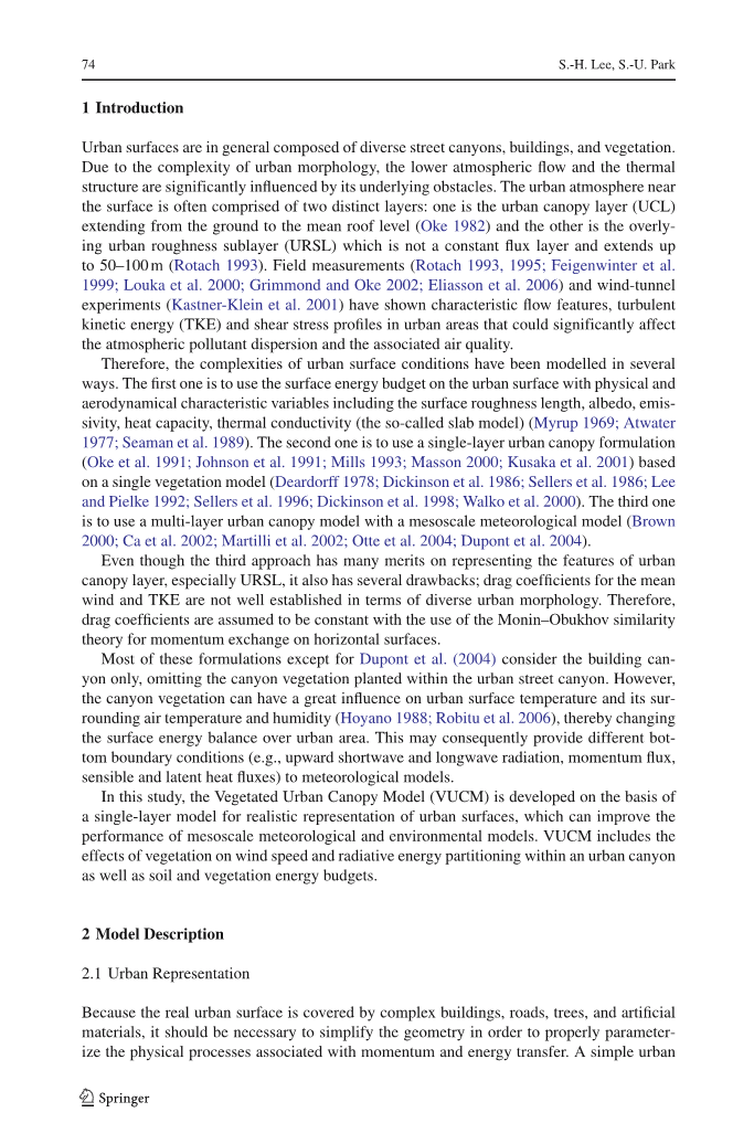 在这项研究中,有植被覆盖的城市冠层模式(VUCM)是在一个能真实体现城市表面特征的单层模型的基础上被发展起来的,这能够提高中尺度气象和环境模式的性能。VUCM包括植被对城市峡谷内的风速和辐射能量分配的影响以及土壤和植被能量的预算。