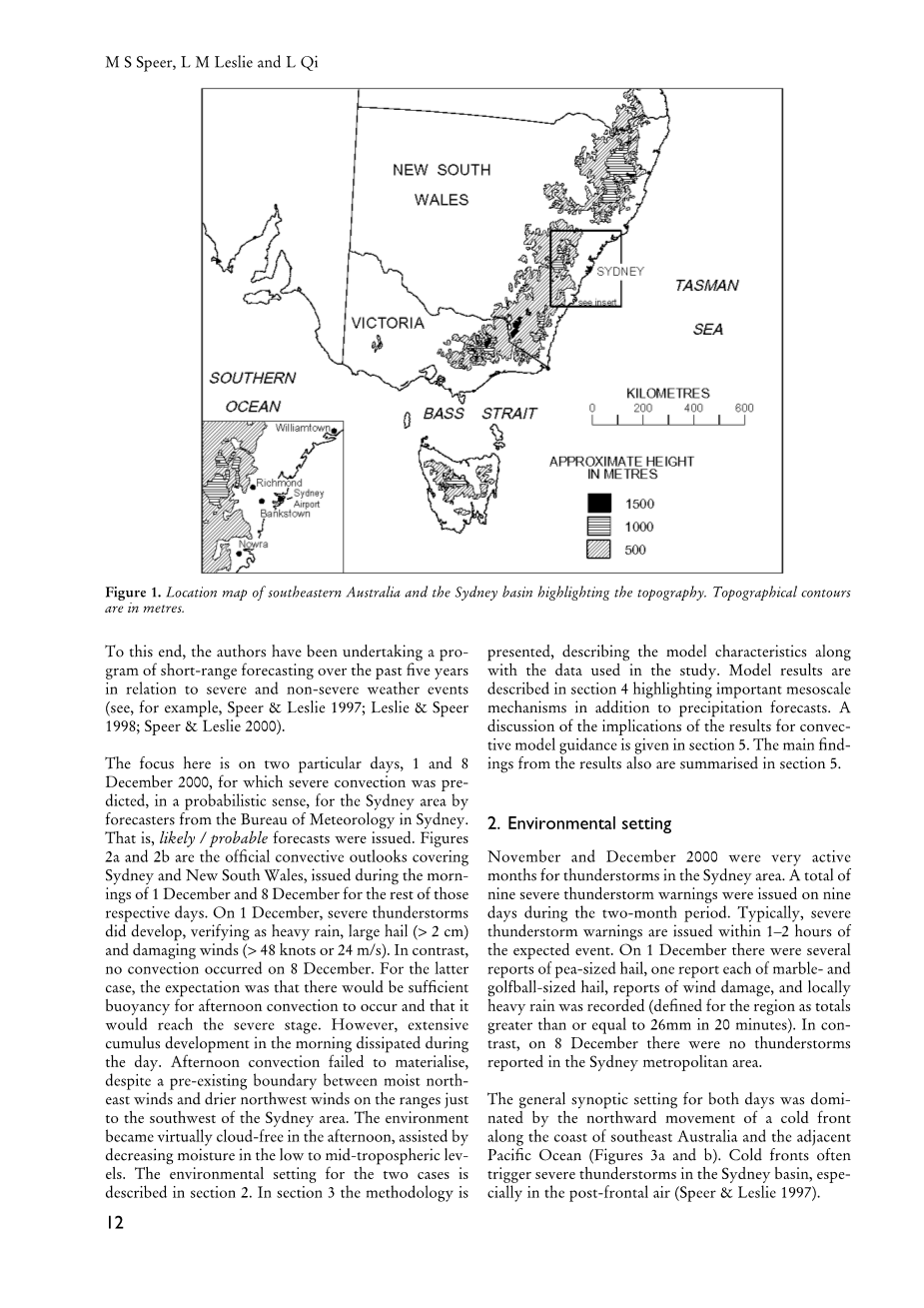 关注点是在2000年12月1日和8日两个特殊的日子里,悉尼地区的强对流被悉尼气象局预报员在概率意义上所预测,也就是说,可能/可能的预测。图2a和2b是发表在12月1日和12月8日早晨,覆盖新南威尔士悉尼的官方对流前景。12月1日,验证如大雨,大冰雹(gt; 2厘米)和破坏性的大风(gt; 48节或24 m / s)的强雷暴发展,相比之下,在12月8日没有对流发生。对于后一种情况,期望是有足够的浮力使下午的对流发生并且它将达到严重的阶段。然而,广泛的积云在白天发展早上在这天期间消散。下午对流未能实现,尽管先前存在潮湿的东北风和干燥的西北风之间,刚好在悉尼的西南地区范围的边界。在下午通过在低的中层对流层水平减少水分帮助环境变得几乎无云。两个案例的环境设置在第二节中描述,在第三节这种描述模型的特点和研究中使用的数据方法被提出,被描述的模型结果在第四节中突出除了降水预报重要的中尺度机制,对流模型指导结果影响的讨论在第五节给出,结果中的主要发现也在第五节总结。