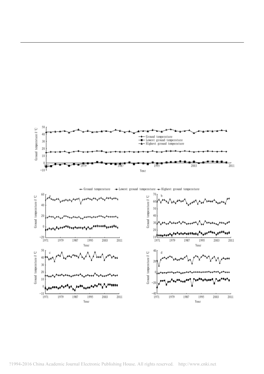图2a所示,三河市1971-2010年期间,全年地表温度,年均最高地表温度和年均最低地表温度分别为18.1、54.4 和1.2℃。年平均最高地表温度的最大值为43. 8℃出现在1993。年均最低地表温度的最大值为1.6℃出现在1991年,最小值为-5.7℃出现在1971年。年度地表温度的气候变化速率,年最高和最低地表温度分别为0.282,0.616和1.095℃每10。年均最低地表温度的增长速度是最显著的。