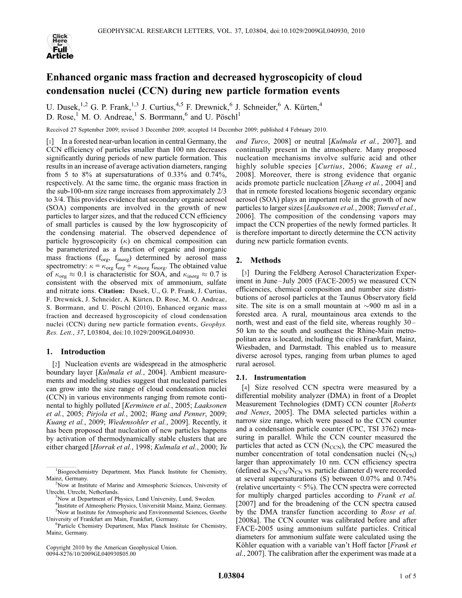 在德国中部的一个森林密集的近城市地区,小于100nm的颗粒的CCN效率在新的颗粒形成期间降低效果显著。这导致平均活化直径的增加,在过饱和时分别为5%至8%,0.33%和0.74%。与此同时,亚100纳米尺寸范围内的有机质量分数从大约2/3增加到3/4。这也为二次有机气溶胶(SOA)成分参与更大尺寸的新颗粒的生长提供了证据,并且小颗粒CCN效率的降低是由冷凝材料的低吸湿性引起的。观察到的颗粒吸湿性(k)对化学组成的依赖性可以作为有机和无机质量分数的函数进行参数化(forg, finorg),由气溶胶质谱法测定:k = korg forg kinorg finorg. korg的获得价值约等于0.1,并显示出SOA的特性,kinorg约等于0.7,与与观察到的铵,硫酸盐和硝酸根离子混合物一致。杜克斯、U., G. P. 弗兰克、J.柯丘斯、F.德鲁尼克、J.施耐德、A.库尔滕、D.罗斯、M.O.安德烈亚、S.鲍尔曼、U.波施奈尔(2010)。新粒子形成事件期间增强的有机质量分数和降低吸湿性的云凝结核、地球物理学 研究 Lett., 37, L03804, doi:10.1029/2009GL040930.
