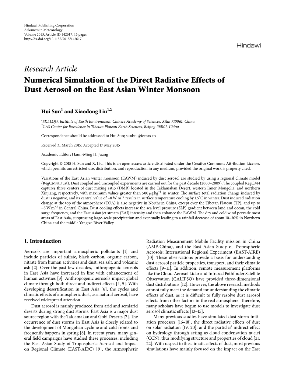 许多先前的研究已模拟过沙尘暴的发生过程[16]沙尘对,太阳辐射的直接辐射效应(19、20),粒子通过作为云凝结核对水汽的产生的间接影响(CCN),从而改变云的结构和性能(21日22)。带有沙尘对气候影响的敬意,目前的模拟工作主要集中在东亚夏季季风上(EASM)。这是使用了粗分辨率全球气候模型(GCMs)(23、24),但在区域尺度上其影响仍然不确定,因为东亚沙尘浓度被全球大气环流模型系统低估了(25、26)。这种情况在最近几年通过发展区域气候模式已经有了改进。例如,Zhang et al[27]使用RegCM3 /Dust模式模拟沙尘气溶胶对东亚气候的影响,他们的结果表明,春季东亚沙尘源区,区域沙尘引起的辐射变化达到-25 W m - 2且引起表面冷却1℃。关于太阳的模拟[28]表明沙尘削弱了东亚夏季风,导致中国东部和南部的降水减少。
