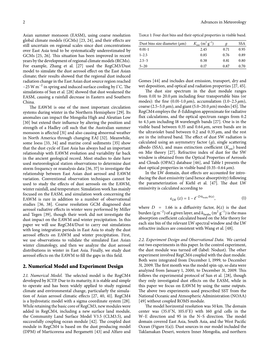 在沙尘模块中沙尘大小谱的范围为0.01到20.0 mu;m包括四个移动式容器(或模式):细粒子(0.01 - -1.0 mu;m),积聚粒子(1.0 - -2.5mu;m),粗粒子(2.5 - -5.0mu;m),巨核粒子 (5.0 - -20.0 mu;m)[45]。RegCM4采用辐射8-Eddington对放射流量进行计算,光学频谱范围为0.2到4.5 mu;m包括18波长带[27]。一个在可见波长范围内在0.35和0.64mu;m之间,七个波长在紫外线范围内在0.2和0.35mu;m之间,剩下的在红外波段。沙尘西南方向的辐射效应是使用一个不对称因子计算的,单一的散射反照率(SSA)和质量消光系数(Kexc)都是基于米氏理论[27]。SW窗沙尘的折射率是从气溶胶和云的光学特性(OPAC)数据库中得出的,表1给出了沙尘在可见波段(0.35 - -0.64 mu;m)光学特性。