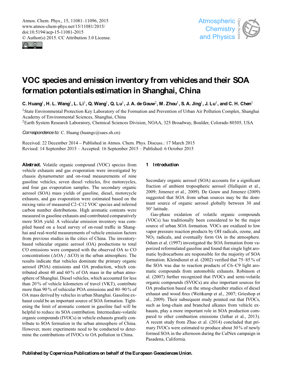 中国上海的VOC种类和车辆排放清单及其SOA形成潜力估算外文翻译资料