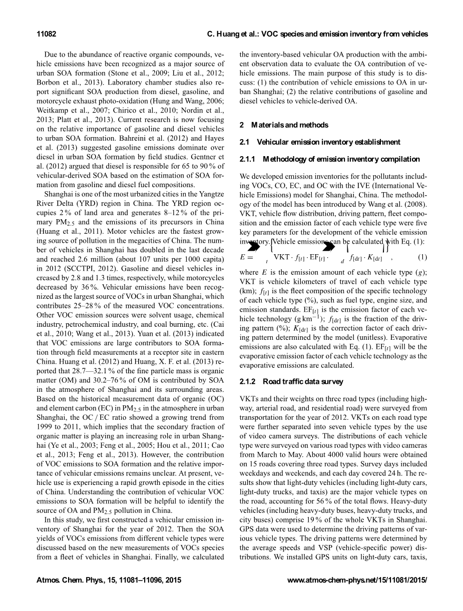 由于活性有机化合物的丰富,车辆排放被认为是城市SOA形成的主要来源(Stone et al。,2009; Liu et al。,2012; Borbon et al。,2013)。实验室研究还报告了来自柴油,汽油和摩托车排气光氧化的重大SOA生产(Hung和Wang,2006; Weitkamp等,2007; Chirico等,2010; Nordin等,2013; Platt et al 2013年)。目前的研究现在集中在汽油和柴油车辆对城市SOA形成的相对重要性。 Bahreini等人(2012)和Hayes等人(2013年),通过实地研究,城市SOA形成中汽油排放主导了柴油。 Gentner等人(2012)认为,汽油和柴油燃料成分的SOA形成估计,柴油占65%至90%。上海是长三角(YRD)地区最城市化城市之一。中国。年排放地区占地面积的2%,占初级PM2.5的8-12%,其前体排放量在中国(Huang et al。,2011)。汽车是中国大城市增长最快的污染源。上海的车辆数量在过去十年翻了一番,2012年达到260万辆(约为每1000人民币107台)(SCCTPI,2012)。汽油和柴油车辆分别增长2.8倍和1.3倍,而摩托车则下降了36%。汽车排放已被认为是上海城市最大的挥发性有机化合物来源贡献了测量的VOC浓度的25-28%。其他挥发性有机化合物排放源是溶剂用途,化工,石油化工,煤炭燃烧等(Cai et al。,2010; Wang et al。,2013)。元等(2013)指出VOC排放量是通过中国东部受体部位的现场测量对SOA形成的重要贡献。Huang et al。 (2012)和Huang,X.F.et al。 (2013年)报道,上海及其周边地区,大气中的微粒质量为有机质(OM)为28.7-32.1%,OM为30.2-76%。由于有机质( OC)和元素碳(EC)在上海城市大气中的PM2.5,OC / EC比率呈现增长趋势1999年至2011年,这意味着有机物的二次分数在上海城市发挥越来越大的作用(叶等,2003; Feng等,2005; Hou et al。,2011; Cao et al。,2013; Feng等,2013)。然而,VOC排放对SOA形成的贡献以及车辆排放的相对重要性仍不清楚。目前,中国城市车辆使用正在快速增长。了解车载VOC排放对SOA形成的贡献将有助于确定中国的OA和PM2.5污染源。在本研究中,我们首先构建了2012年上海的车辆排放清单。然后,SOA产量根据上海车队VOCs物种的新测量,对不同车型的挥发性有机化合物排放量进行了讨论。最后,我们使用环境观测数据计算了基于库存的车辆OA生产,以评估车辆排放的OA贡献。本研究的主要目的是讨论:(1)上海城市车辆排放对OA的贡献; (2)汽油和柴油车辆对车辆OA的相对贡献。