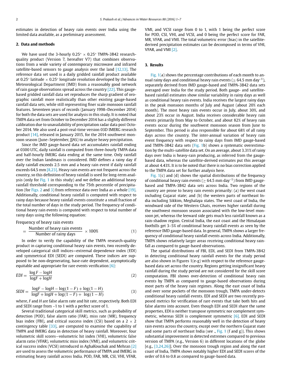 由于IMD雨量计观测数据集的累积降雨量在0300 UTC结束,日降雨量是用同一时间结束的三小时TEMP数据和半小时IMERG数据计算而得。实验时,仅仅考虑在印度陆地降雨量。如果日降雨量超过2.5毫米,IMD定义为雨天,如果日降雨量超过64.5毫米,定义为强降雨事件[8,23]。全国各地的强降雨事件不是很频繁,所以强降水的这种定义仅仅用于长期分析中(本文中指图1)。我们定义一个附加的强降雨阈值,它与印度地区参考数据降水的第75个百分位数一致的(图2和图3)[19]。此外,条件性强降雨计算与雨天有关,因为强降雨事件是研究阶段总天数中的一小部分。使用下面的等式计算条件性强降雨事件的频率: