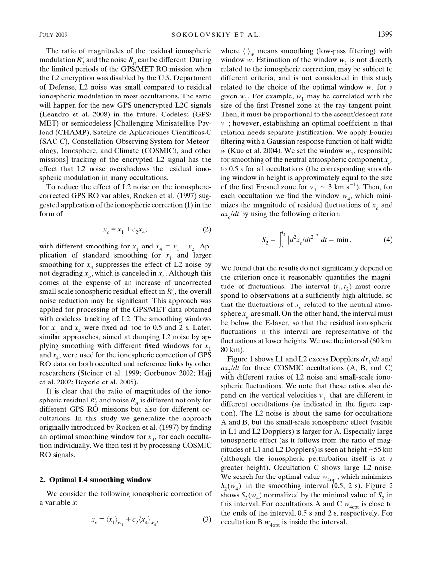 对于x1和x4=x1-x2具有不同的平滑。标准平滑应用于x1和更大的平滑x4可以通过不降低xa来抑制L2噪声的影响,这在x4中被取消。虽然这是以增加了在未修正的小规模的电离层残效为代价,总体噪声降低可以是显著。该方法被应用于用L2的无代码跟踪获得的GPS / MET数据的处理。x1和x4的平滑窗口固定为0.5和2 s。后来,通过对x1和x4的不同固定窗口进行平滑处理来阻止L2噪声的类似方法被用于其他研究者对掩星和参考连接的GPS RO数据的电离层校正(Steiner等人1999;Gorbunov 2002;Hajj等人2002; Beyerle等人2005)。