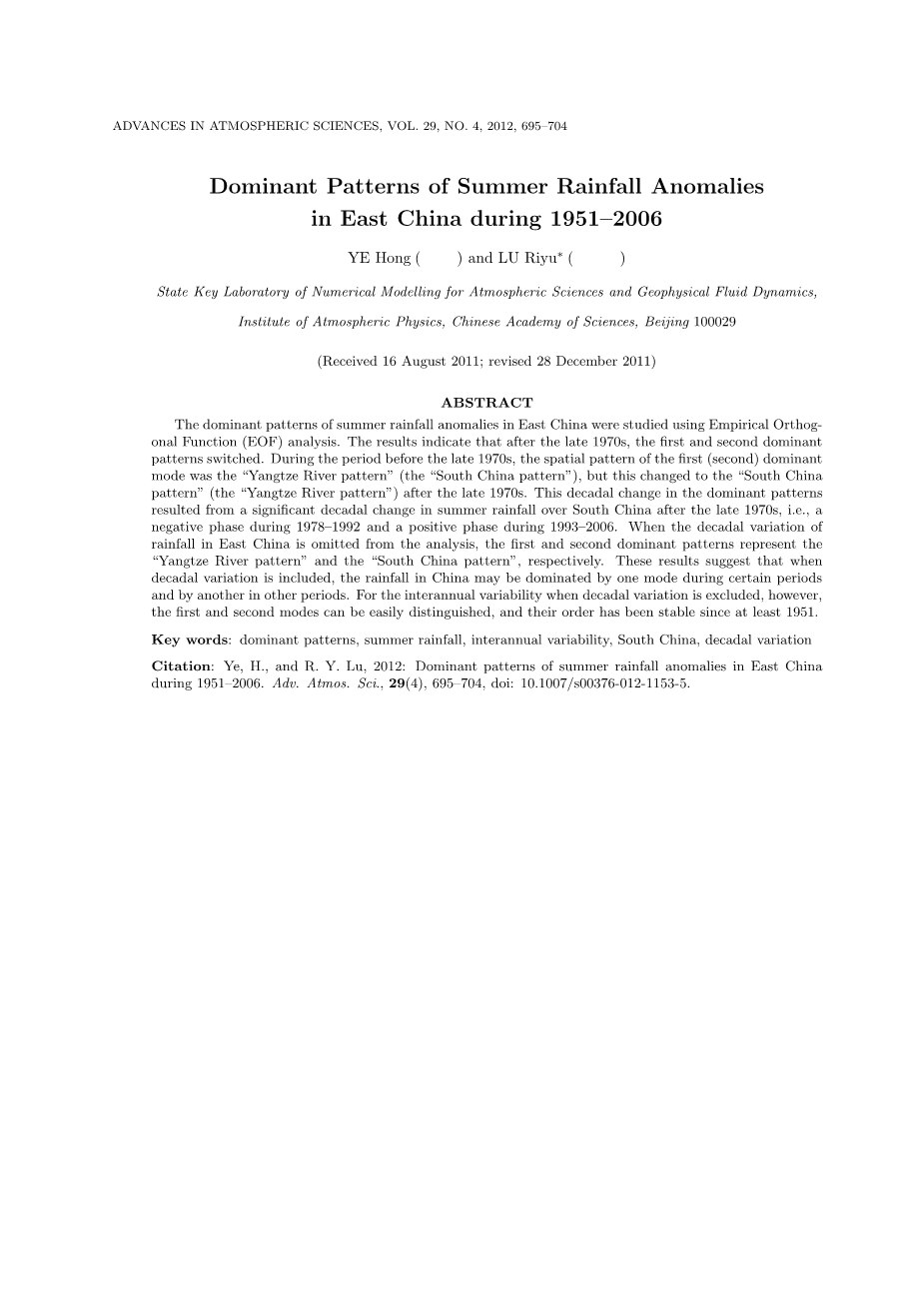 在本研究中使用 EOF 方法分析了中国东部夏季降水空间结构的时空变化。1951-2006 年期间,最主要的模态是'长江型',也就是长江流域中下游地区大的降水异常。第二种模态是与中国南方(在本文中称为'华南型')的明显变化有关。这些结果与前人的研究相一致,不能区分这两种模式。