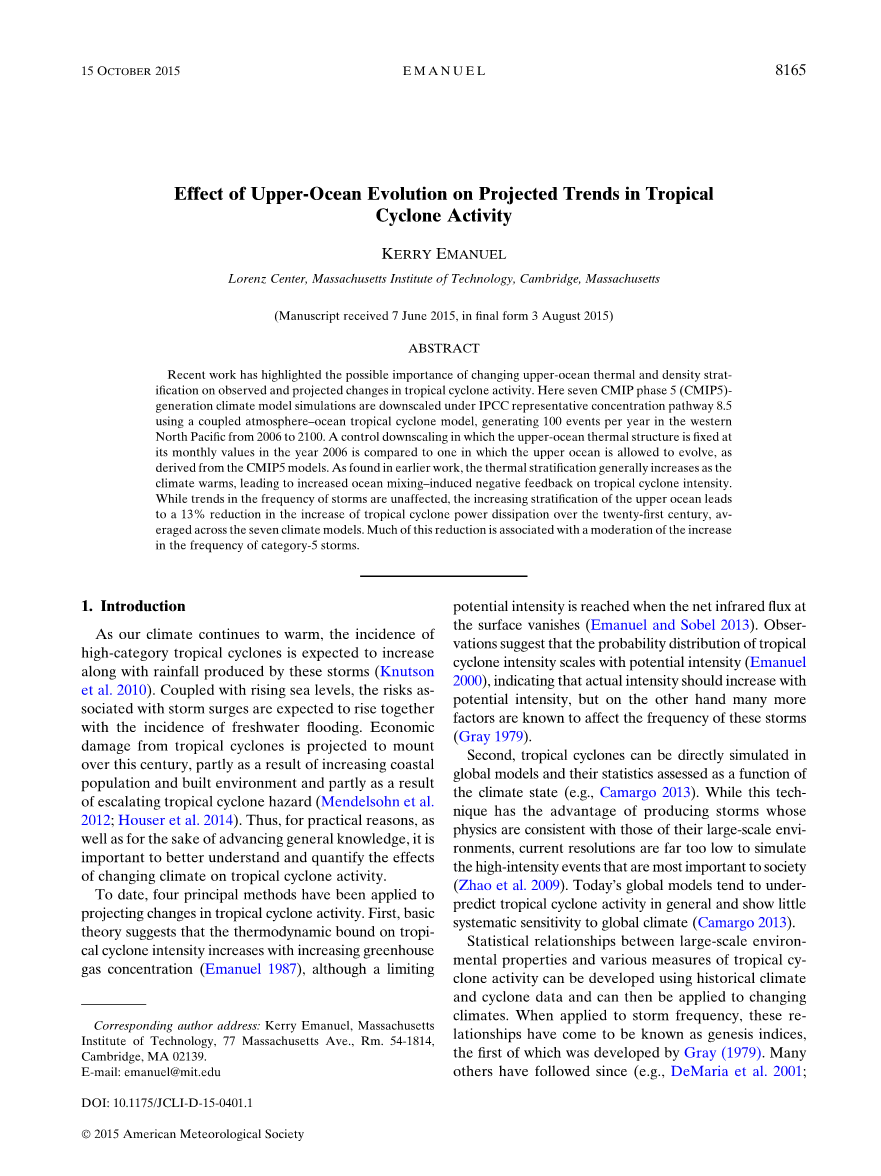 作者和他的同事发展出了一个降尺度技术,使用一个简单的海气耦合热带气旋模式,在角动量坐标下,可以得到热带气旋中心的高分辨率解。在当前气候作为初始条件时,降尺度技术重现了全部的观测的热带气旋强度分布;捕捉到了空间的,季节的和年际的变化;也捕捉到了短期气候波动,如厄尔尼诺。模式计算成本很低,可以模拟几万或几十万个热带气旋。这个模式预测21世纪热带气旋强度和数量均会增加。