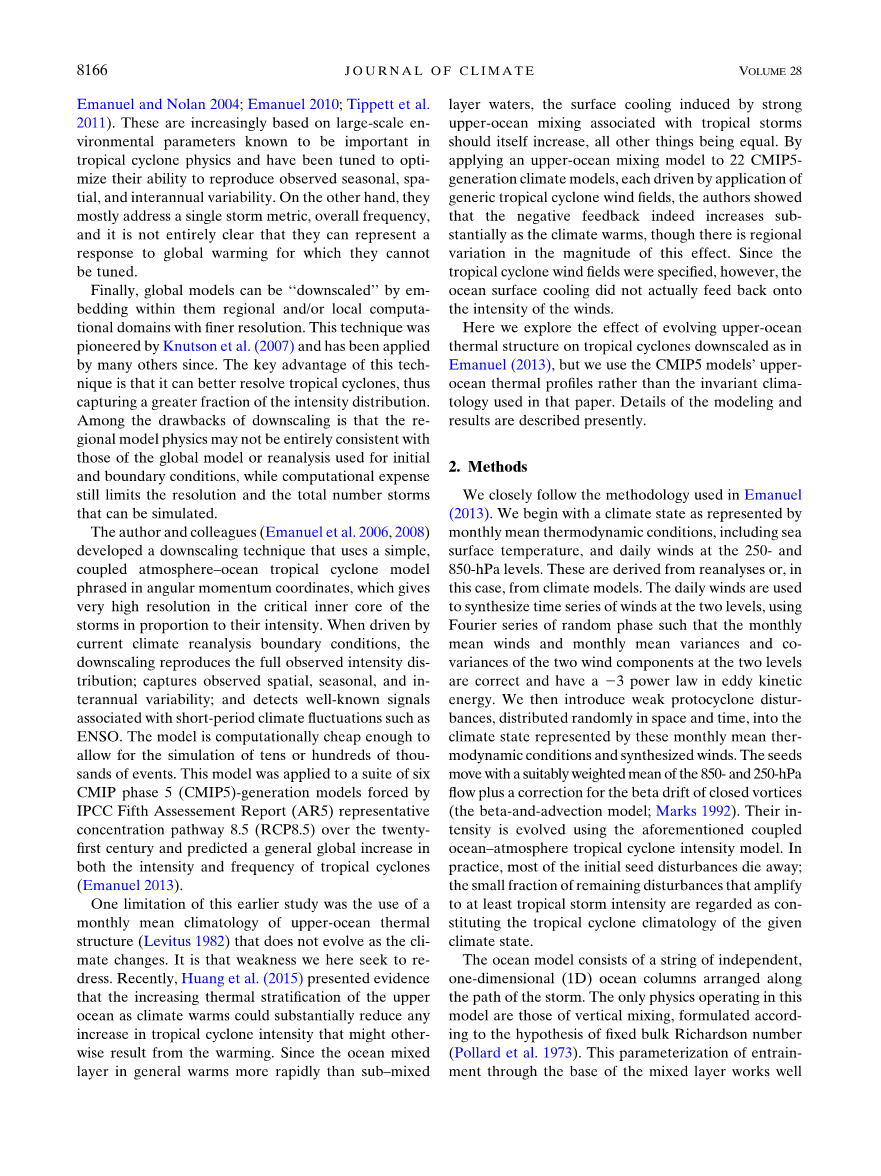这个研究的局限在于使用了月平均的上层海水热力学结构,而不是随气候变化而变化的。这就是我们这里要纠正的局限。最近,Huang指出了证据,上层海水分层的增加会使有气候变暖带来的热带气旋强度增加减弱。由于海水的混合层比次混合层变热的快,所以与热带气旋相关的上层海水混合导致的海表面降温会增加。把一个海水混合层模式应用到22个CMIP5气候模式中,每个都有热带气旋风场强迫,作者指出气候变暖会使负反馈增强,尽管不同区域这个影响大小不同。由于风场固定,所以负反馈并不会作用与风场上。