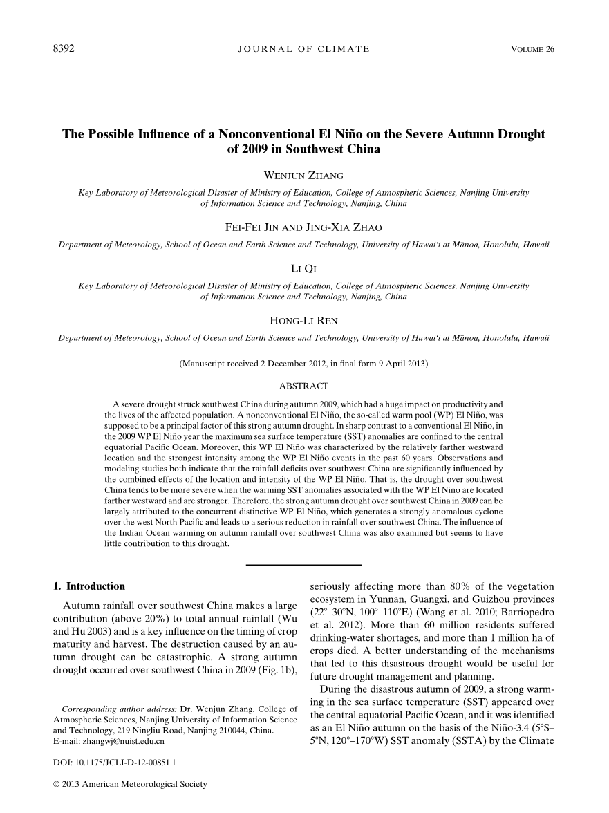 一次非常规的厄尔尼诺事件对2009年中国西南地区秋季干旱的影响外文翻译资料