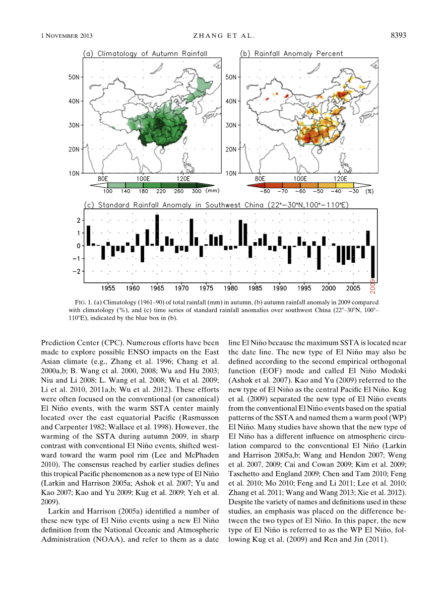 在2009年损失惨重的秋天,中部赤道太平洋出现了海洋表面温度的强烈升温,根据气候预报中心(CPC)提供的Nino-3.4区(5°S-5°N,120°- 170°W)海温距平(SSTA),认定为厄尔尼诺年。ENSO对东亚气候的影响已经进行了许多研究,(例如Zhang等人1996; Chang等人2000a,b; B.Wang等人2000,2008; Wu和Hu 2003; Niu和Li 2008; L.Wang等人2008; Wu等人2009; Li等人2010,2011a,b; Wu等人2012)。这些努力往往集中在常规的(或规范的)厄尔尼诺事件,SSTA暖中心主要位于赤道东太平洋(Rasmusson和Carpenter 1982; Wallace等a1.1998)。然而,2009年秋季的SSTA变暖与传统的厄尔尼诺事件形成鲜明对比,西移至暖池边缘(Lee和McPhaden 2010)。早期研究达成的共识将这种热带太平洋现象定义为一种新型厄尔尼诺(Larkin and Harrison 2005a; Ashok et al。2007; Yu and Kao 2007; Kao and Yu 2009; Kug et al。2009; Yeh et al. 2009)。