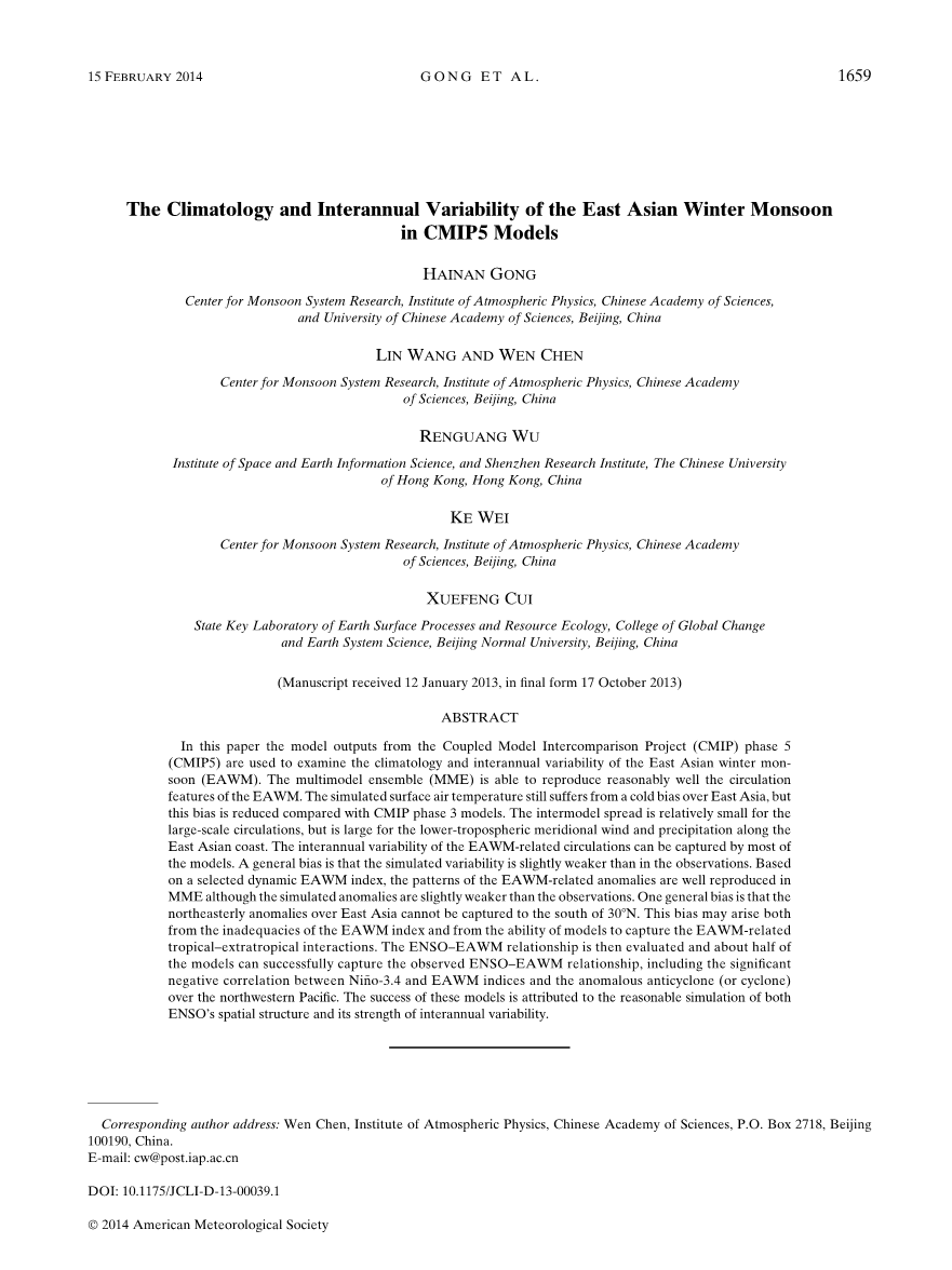 本文中,基于1971–2000年的东亚季风来评估其特点的,该时间段是世界气象组织(WMO)推荐的标准时间。对GPCP降水数据运用,考虑将1979-2005年用于降水量分析。年际变率量是在原始数据基础之上,进行线性去趋势处理后得到的。采用了30年(1971 - 2000)冬季十二月,一月,和二月(DJF)三个月的月平均数据,在这里,我们一惯认为1971年指的是1970 / 71的冬天。运用了回归分析和相关分析方法对结果进行了评估,多模式集合(MME)计算采用了简单的加权平均法。