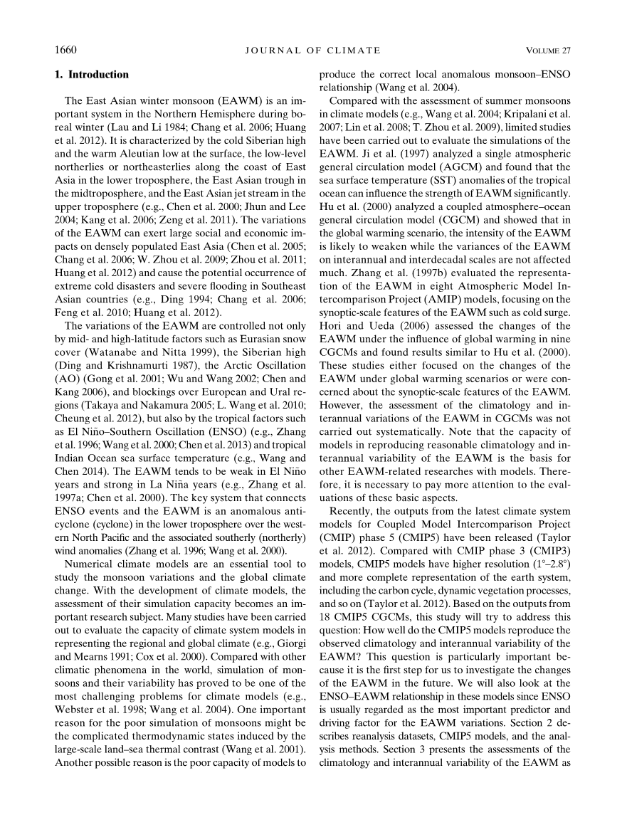 与气候模式对夏季风的模拟评估相比,很少有对东亚冬季风模拟的评估。(Ji et al.1997)分析单一大气大气环流模式(AGCM),发现热带海洋表面温度(SST)的异常能够很大程度上影响东亚冬季风EAWM;Hu et al.(2000)分析了一个耦合的大气—海洋大气环流模式(CGCM),得出在全球变暖的情况下,东亚冬季风强度很可能减弱,而其年际、年代际变化基本不受影响;Zhang et al.(1997)评估了大气模式比较项目(AMIP)中的八个模式对东亚冬季风(EAWM)的模拟情况,重点针对EAWM的天气尺度特征如冷潮。Hori和Ueda(2006)评估了在全球变暖的影响下,9个CGCMs中的EAWM的变化,发现结果与Hu et al.(2000)研究结果相似。这些研究都是以在是全球变暖情景下并且都关注了东亚冬季风的天气尺度特征。然而,耦合模式对气候态和东亚冬季风的年际变率不能够系统地进行。注意到模式能够合理地再现气候和东亚冬季风年际变率都是基于其他国家的相关研究与模型。因此,有必要更加注重对基本方面的评估。