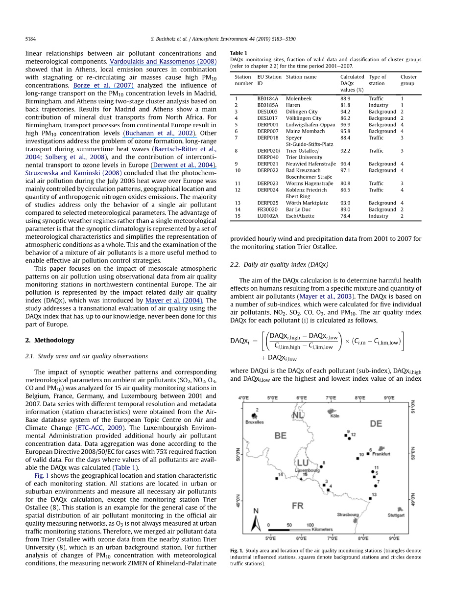 利用2001-2007年比利时、法国、德国和卢森堡地区15个空气质量监测站的资料,分析天气形势和相关气象要素对环境空气质量污染的影响。不同时间分辨率和元数据信息的数据序列来自欧洲空气与气候变化研究中心的空军基地数据库。卢森堡环境署提供了逐时空气污染浓度数据集(表1)。