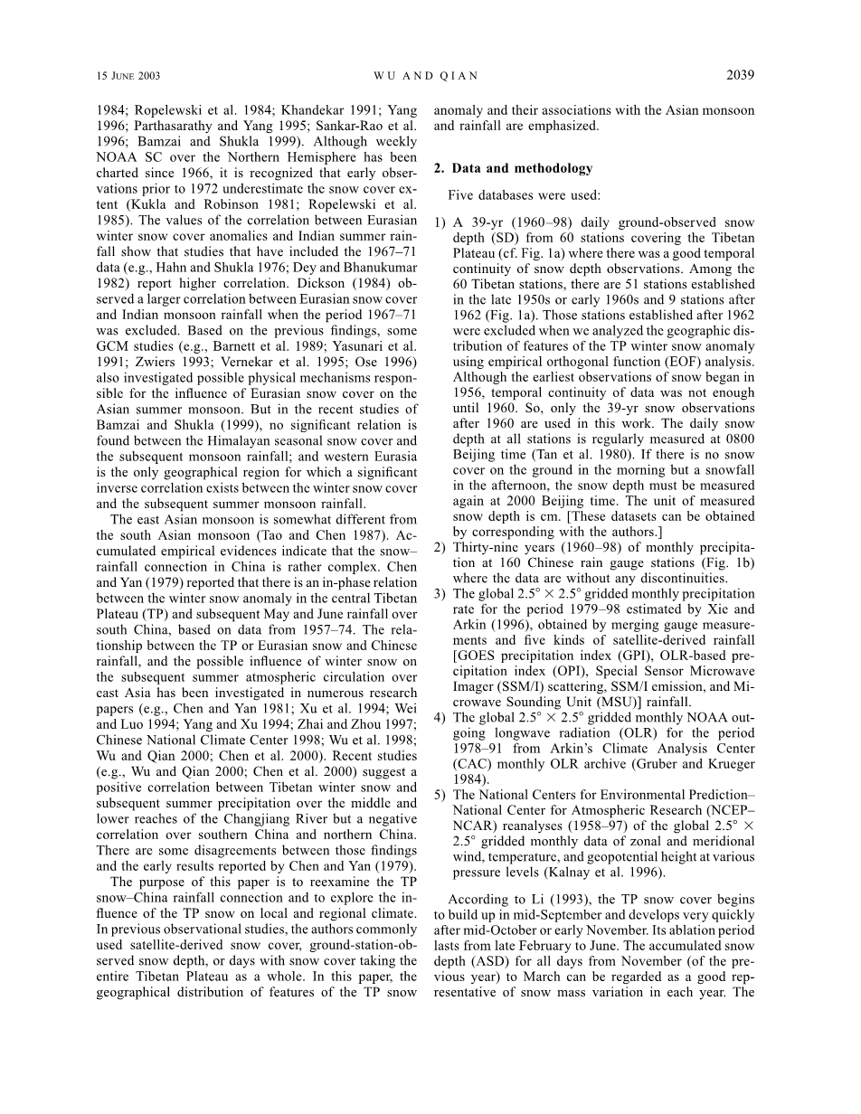 2)39年(1960–98)在中国的160个雨量站的月降水量(图1b),数据不间断。
