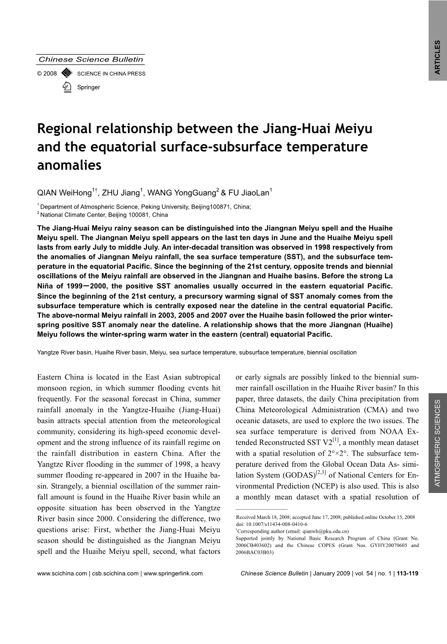 江淮梅雨雨季可以分成江南梅雨期和淮河梅雨期。江南梅雨期出现在6月下旬,淮河梅雨期从7月上旬持续到7月中旬。在1998年一个年代际过渡分别从江南梅雨降水异常,海温和赤道太平洋地下温度被观察到。从21世纪初,梅雨降水相反的趋势和两年一次的震荡在江南淮河流域被观察到。在1999-2000年强大的拉尼娜之前,赤道东太平洋通常出现正海温异常现象。20世纪初以来,一个海温异常变暖的前兆信号来自集中暴露在赤道太平洋中部国际日期变更线附近的地下温度。以上在2003,2005,2007年淮河流域的异常梅雨降水在国际日期变更线附近的之前冬春海温异常现象之后出现。这显示了江南(淮河)梅雨偏多在赤道东(中)太平洋冬春暖水之后出现的关系。