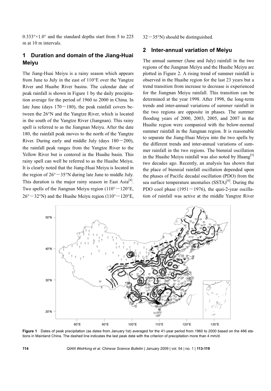 江淮梅雨是6-7月份江淮流域110°E以东地区的雨季。图1显示了我国1960-2000年日平均降水的峰值降水日期。在6月底(170-180天),26°N到长江被峰值降水覆盖,即位于长江以南地区(江南)。这段雨期指的是江南梅雨。180天之后,降水峰值移动到长江以北。在7月上中旬(180-200天),降水峰值区域从长江扩展到黄河,但是中心位于淮河流域。这段雨期指的是淮河雨期。这清楚地指出江淮梅雨从6月底到7月中,位于26°N到35°N地区。这段时间是东亚主要雨季[4]。江南梅雨区(110°-120°E,26°-32°N)和淮河梅雨区(110°―120°E,32―35°N)这两个雨期应该被分开。