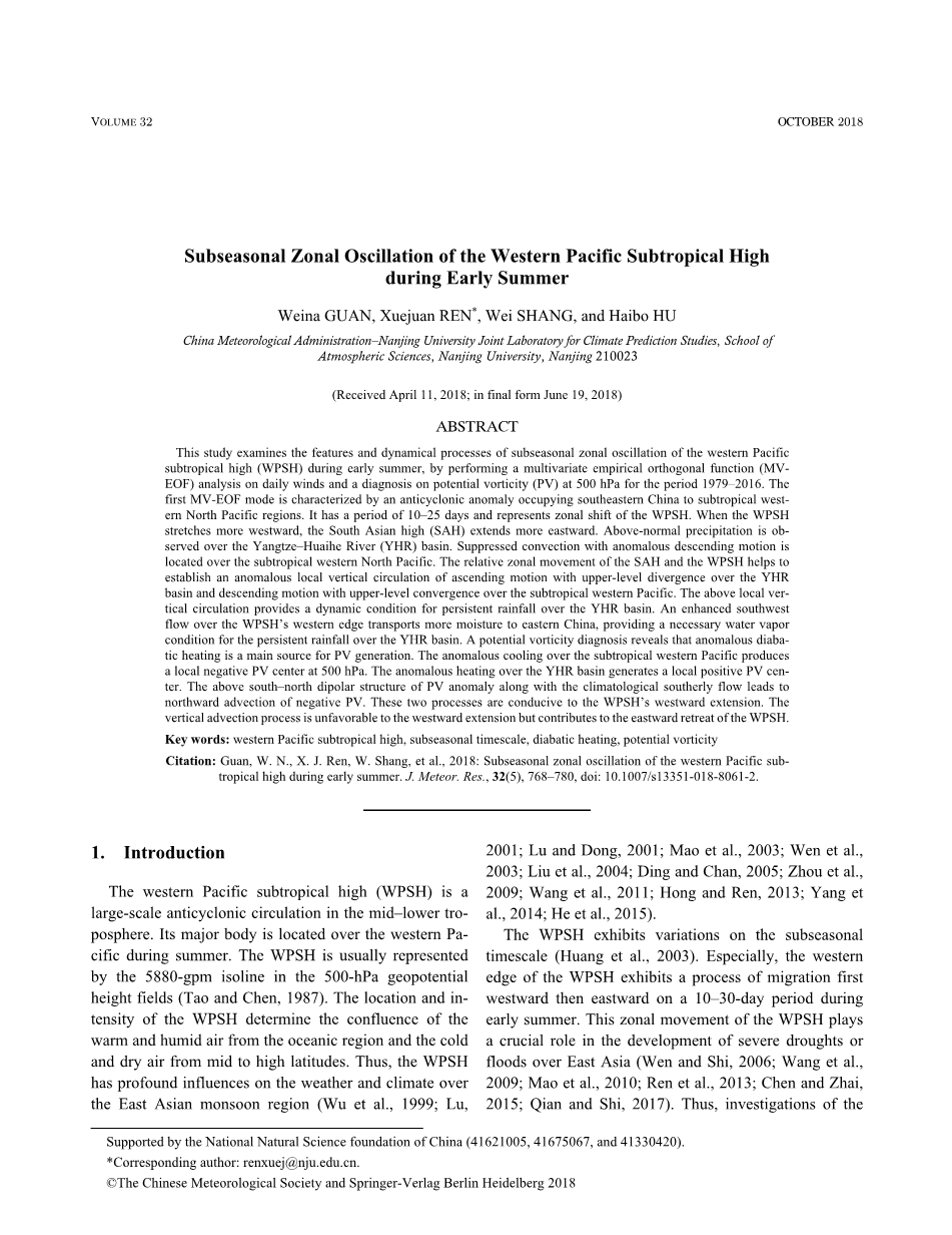 关键词:西太平洋副热带高压;亚季节时间尺度;非绝热加热;位势涡度