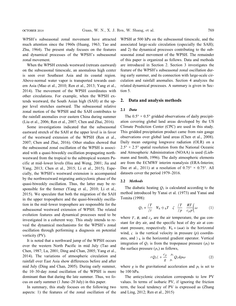 一些调查表明,上层SAH的季节性向东延伸有利于WPSH的向西延伸。其他研究表明,WPSH的中下层季节性纬向振荡与从中部向热带亚热带西太平洋西北方向传播的准双周振荡有关。特别是,WPSH的向西延伸伴随着准双周振荡的反气旋西北向迁移阶段。因此,后者可能是前者的原因。我们推测,对流层上层的SAH迁移和对流层中下层的准双周振荡都是造成副高季节性西伸的原因。需要以连贯的方式研究移动特征和动态过程。本研究旨在通过对位势涡度(PV)进行诊断来揭示WPSH区域振荡的动力学机制。