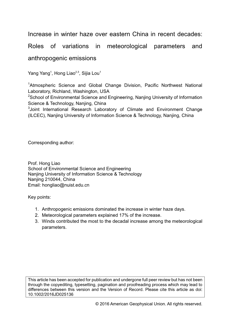 关键字:1、人为排放占主导的冬季阴霾天的增加