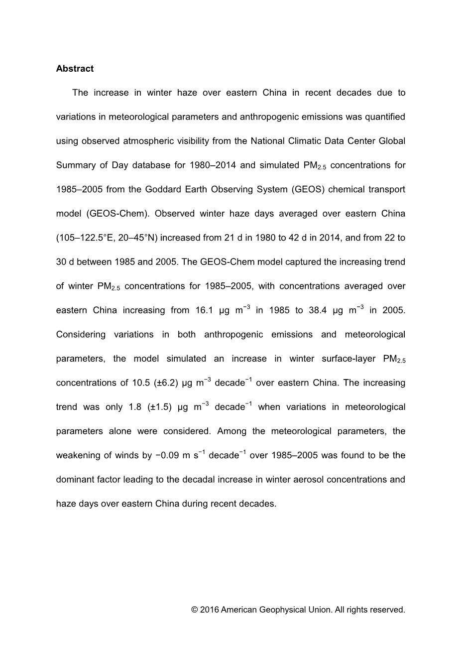 中国东部冬季雾霾天年代际变化的增长通常归因于人为气溶胶排放伴随快速的城市化进程和经济发展的增长。一些研究还表明,气象参数对雾霾天的年代际变化也有贡献。李等(2016)发现雾霾日与东亚冬季风指数之间的负相关系数为-0.41到 -0.49(指标的定义在850 hPa风或者位势高度),并认为在弱的东亚冬季风年近地面风的削弱减少了雾霾外流,有利于污染物在中国东部的积累。这一机制是考虑到在1969-2000年之间,风速每十年下降0.2 m· s-1 (Xu et al.,2006)。丁和刘(2014)发现在1961–2011年间,由于中国表层空气温度从10.5°C升高到10.8°C,大气表层相对湿度从70%降低到67%,可能是造成每年雾霾天从4天增加到15天的原因。理解雾霾天和气溶胶浓度增加的原因对于制作空气质量的长期规划是必要的。然而,以往的研究很少有定量地将人为排放和气象参数对近几十年来中国东部雾霾天的年代际变化影响的作用分离开研究讨论的。