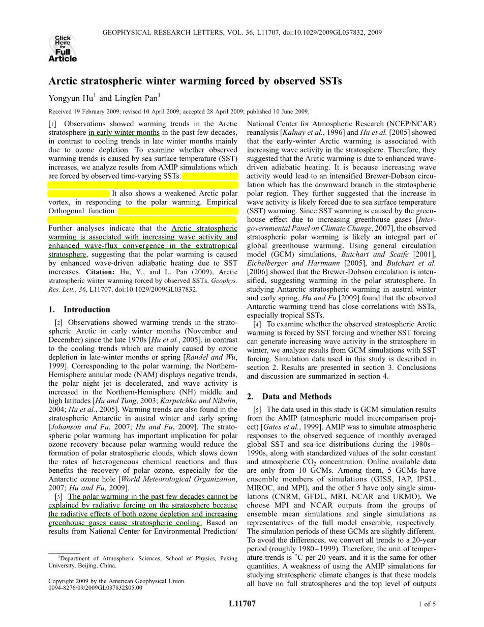 题 目 用观测的海表温度强迫的北极平流层冬季增暖