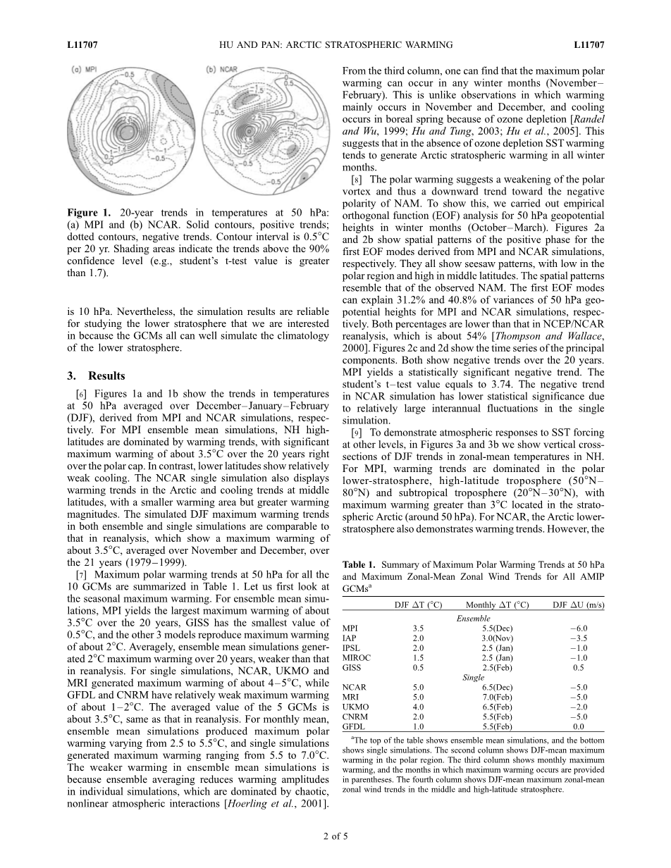 10个GCM极区50hPa的最大增暖变化总结在表1中。让我们先看看最大季节增暖。对于集合平均模拟,20年MPI升温最大,最大升温3.5℃,GISS升温最小,最小升温0.5℃,而其他3个模式最大升温约2℃。平均来说,集合平均模拟20年最大增暖2℃,比再分析低。 对于单个模拟,NCAR,UKMO和MRI最大升温约4-5℃,而GFDL和CNRM具有约1-2℃的相对较弱的最大升温。5个GCM的平均值为约3.5℃,与再分析中的相同。对于月平均,集合平均模拟极地最大增暖2.5-5.5℃,单个模拟5.5-7.0℃。集合平均模拟中增暖小是因为集合平均没有单个模拟非线性大气相互作用的加热。(Hoerling et al., 2001)从第三列,可以发现极地极大变暖可以发生在每个冬季(11月 - 2月)。这不同于变暖主要发生在11月和12月,并且由于臭氧损耗在北极春季气温下降的观测,(Randel and Wu, 1999; Hu and Tung, 2003; Hu et al., 2005)。这表明在没有臭氧消耗的情况下,SST变暖趋势在所有冬季都会产生北极平流层变暖。