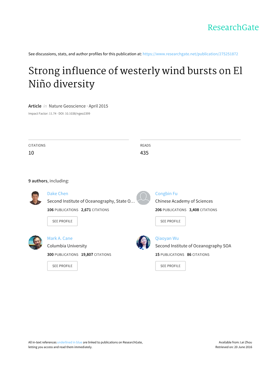 El Nino一直是季节性年际预测的典型,因为它是迄今为止地球气候系统中最有活力和影响力的短期变化。El Nino的潜在可预报性可能是数年,但是实时El Nino的预测仍是一个难以捉摸和艰巨的目标。这可能是因为可预见性的预测是基于由El Nino变异的单一模式主导的模型或基于比较大的El Nino事件的后报技能为主的模式,而实际上El Nino有各种各样的特性,尤其是在过去的十年。我们的观点对于El Nino多样性具有可预见性有几个影响。首先,适当考虑WWB的影响对气候模型来提高它们对El Nino的模拟和预报是有必要的。事实上,许多模型往往产生一个定期的集中在赤道中东部太平洋的年际振荡表明它们只能产生一个典型的周期,因此这会限制预测能力。其次,即使状态依赖的WWBs被模拟或参数化,在赤道中东太平洋的强暖事件本质上会比日界线附近的弱暖事件更加好预测,因为WWBs能更强烈地调整,因此在大暖期间更有确定性。最后,El Nino/La Nina基本循环(比如赤道太平洋上游海洋热含量)以及其与WWBs的相互作用的措施能作为事件发展的前提。